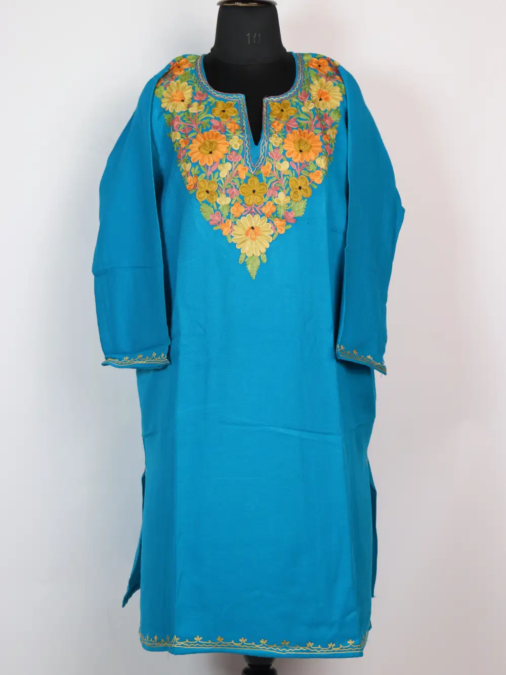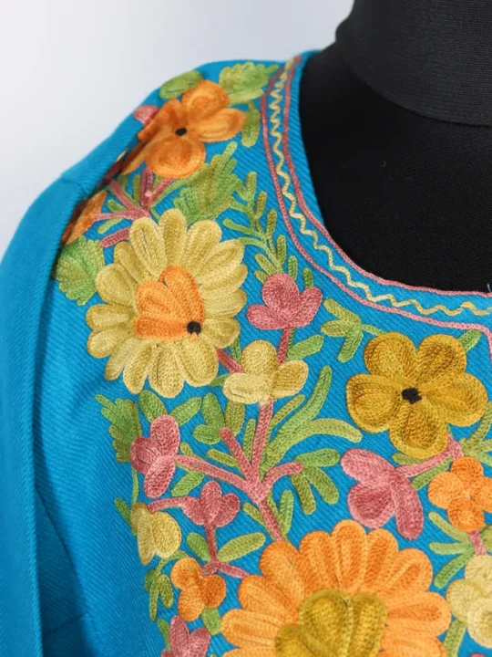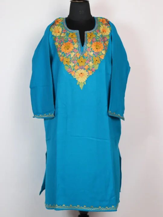 This pheran in cashmilon wool pairs everyday practicality with feminine detail. The neckline is decorated with mustard and tiny floral and green leafy patterns through Aari embroidery, creating a soft artistic touch. Women will enjoy its cozy feel and effortless style, that makes it suitable for various occasions. Neither too heavy nor too plain, this garment brings balance, offering warmth with an elegant finish in the winter season.