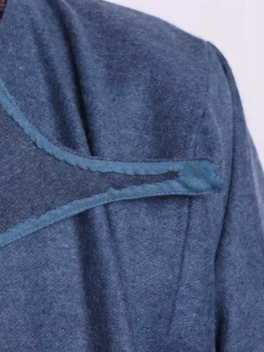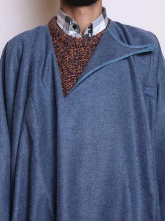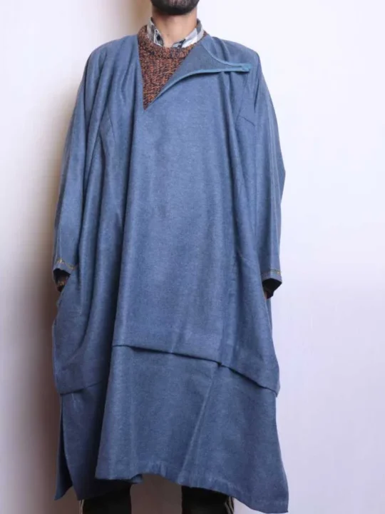 This is a classic old style pheran for men. It’s rarely available now. The neck has a unique Kashmiri style and there’s also the traditional extra stitching at the bottom.