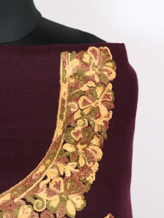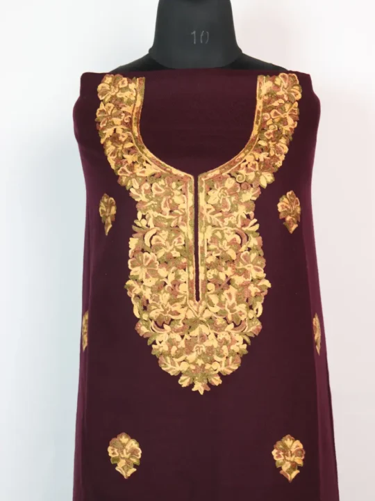 Front panel has been fully embroidered in booti style and the neckline in floral motifs which have been done in green and yellow hue threads. This unstitched 2pc wine Suit in cashmilon wool blends warmth and elegance. It is ideal for winter layering, and it fits beautifully in winter Kashmiri suits and Kashmiri woolen suits for ladies categories. This garam soot reflects elegant Aari embroidery craftsmanship.