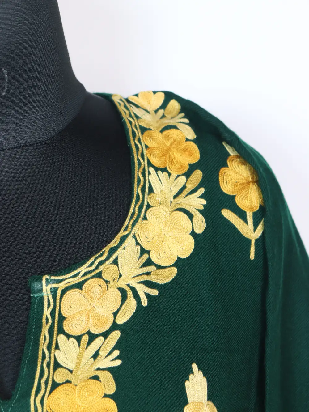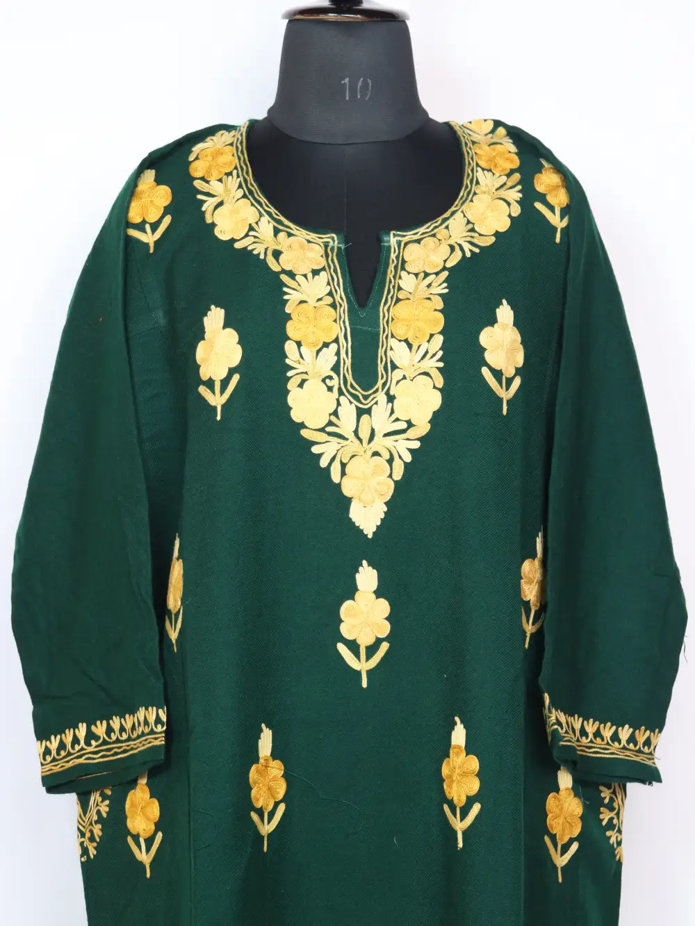 A dak green Kashmiri pheran made in Cashmilon Wool features Aari work in floral booti style all over it. It ncludes pockets both side for everyday ease. and it provides functionality with quiet elegance.