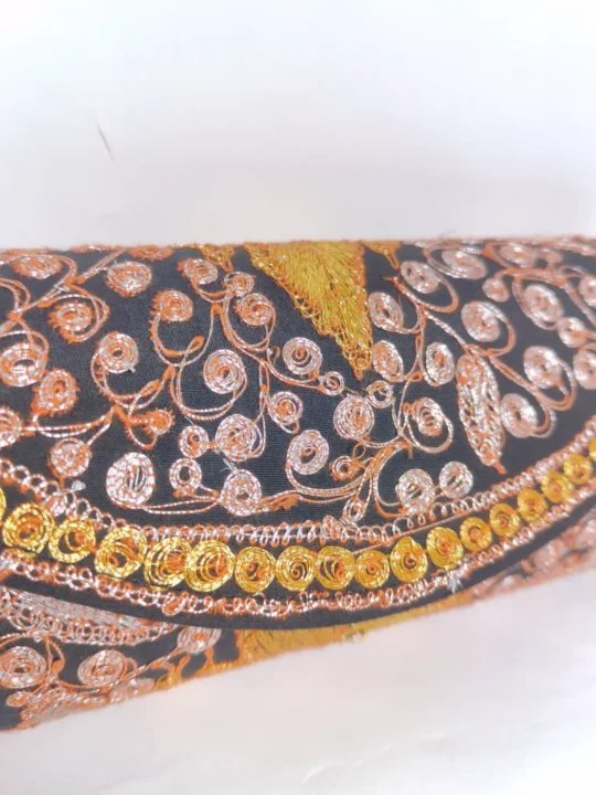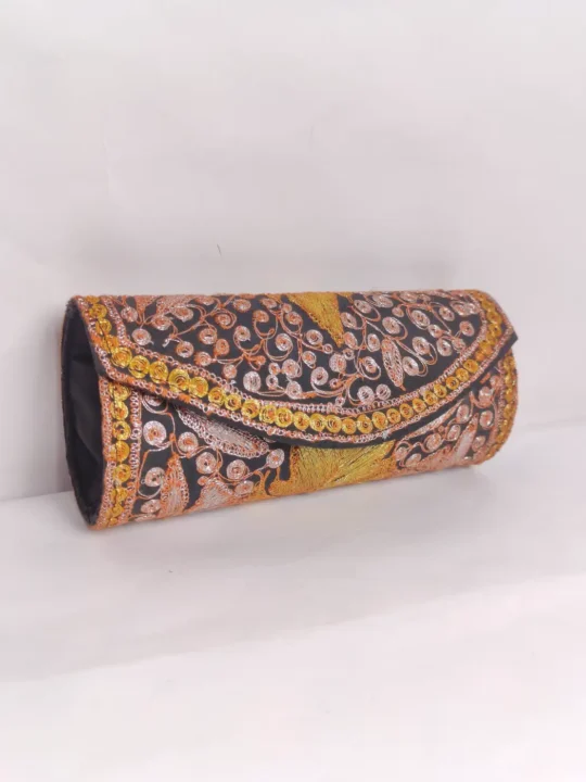 Crafted from black silk, this clutch bag is adorned with detailed tilla work. Curving vine motifs and compact floral elements are spread across the surface, which gives this clutch bag a balanced yet ornate Kashmiri aesthetic with a classic handcrafted finish.