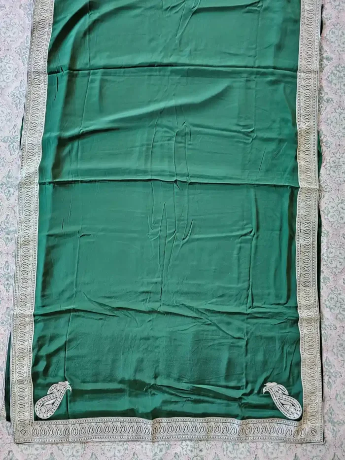 The georgette keeps it wearable, the tilla embroidery makes it special. You’ll find deep continuous badaam on running borders and big badaam motifs in the corners. From daily errands to family lunches, this saree plays well everywhere.