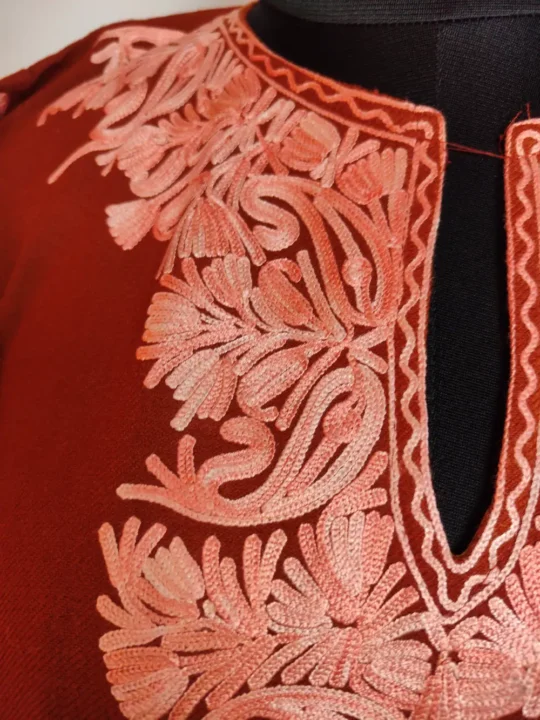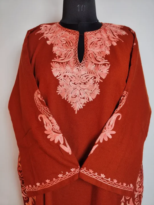 A composed brown phiran dress in Cashmilon Wool with floral Aari at the neckline, sleeves and front back panels and it has pockets both the sides for daily convenience.