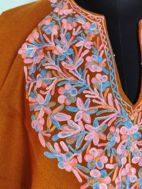 A brown Kashmiri embroidered poncho in Cashmilon wool adorned with floral Aari kaam at neckline and continuous near-border embroidery. It is side-by-side 60 inches and its length is 33 inches with lining included.