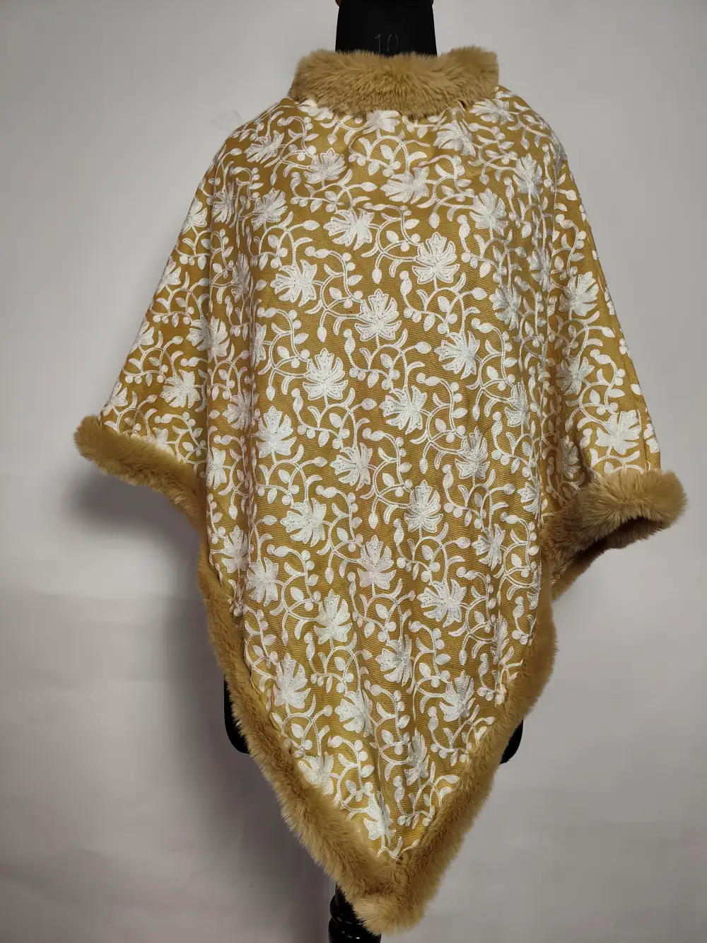 Made in soft (mulaim) Cashmilon wool, this Fur Poncho blooms with white chinar Aari embroidery across its surface. The brown color lends it a versatile, elegant appeal fit for every winter setting. It is measuring 35 inches long and 43 inches wide, it offers both coverage and comfort. It comes with no lining for a free, easy wear. It is a wonderful women poncho without hood choice for cozy evenings.