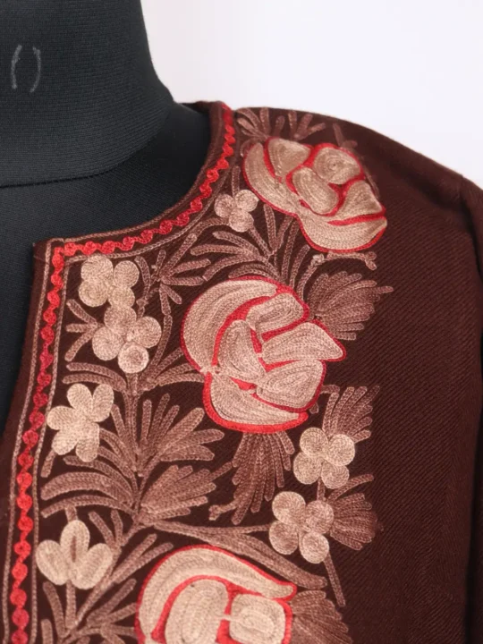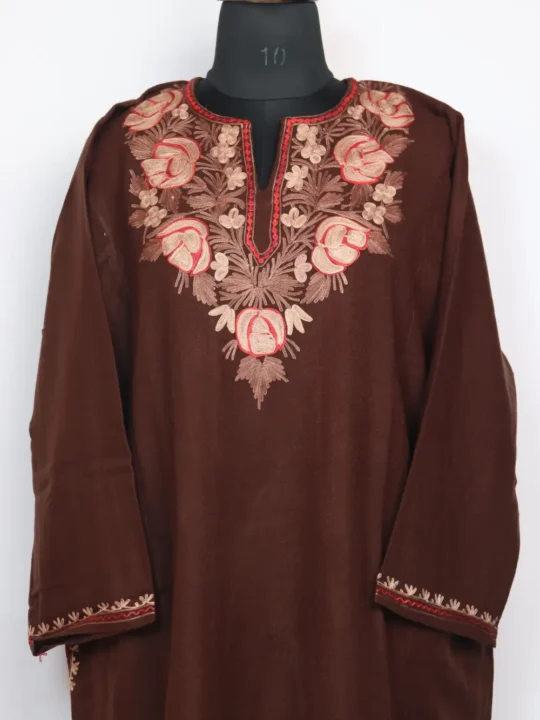 Premium Cashmilon wool in dark brown with elegant Aari embroidery at the neckline in floral patterns, shapes this kashmiri phiran, Chest size 52 and length 43 inches ensure a relaxed fit that suits layered winter dressing.