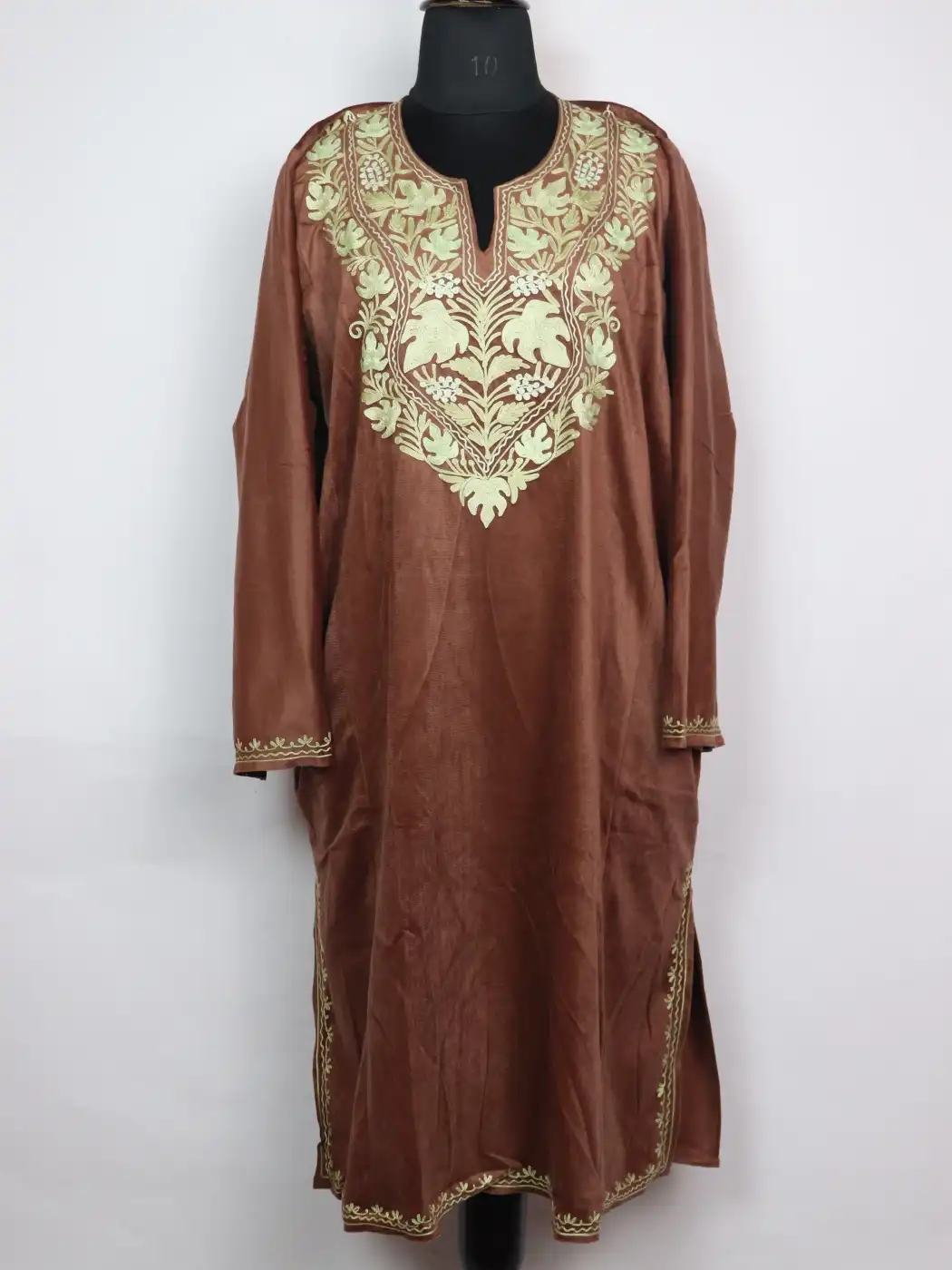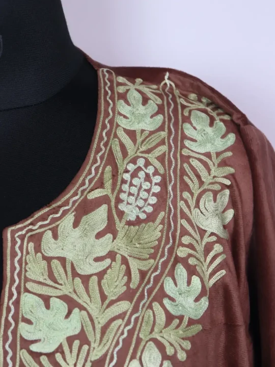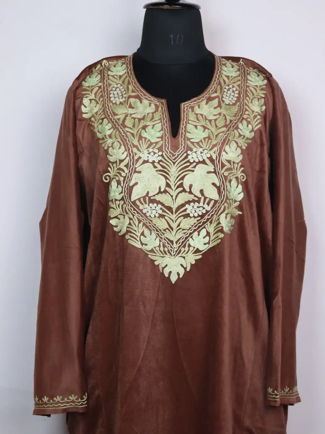 Light and soft like a small cloud, this velvet feran stays cosy. Floral aari with chinari decorates the neckline, and the 56 chest with 44 length offer comfort with pockets. It falls naturally on the body and keeps warmth locked in. Easy to pair with any winter look.