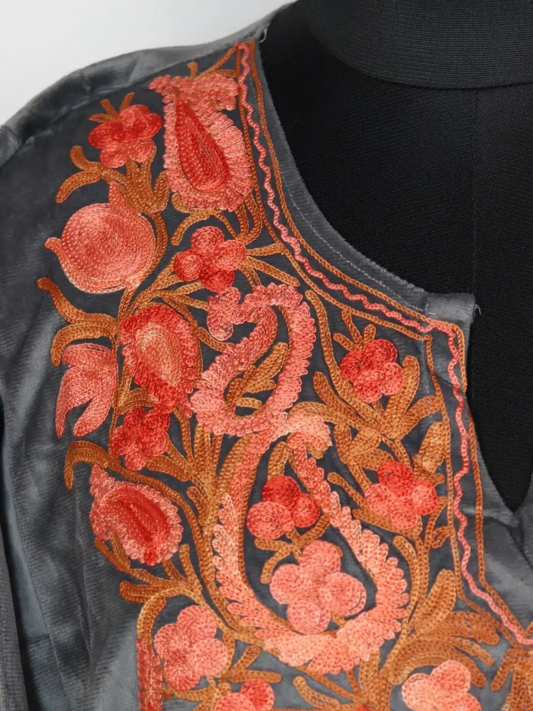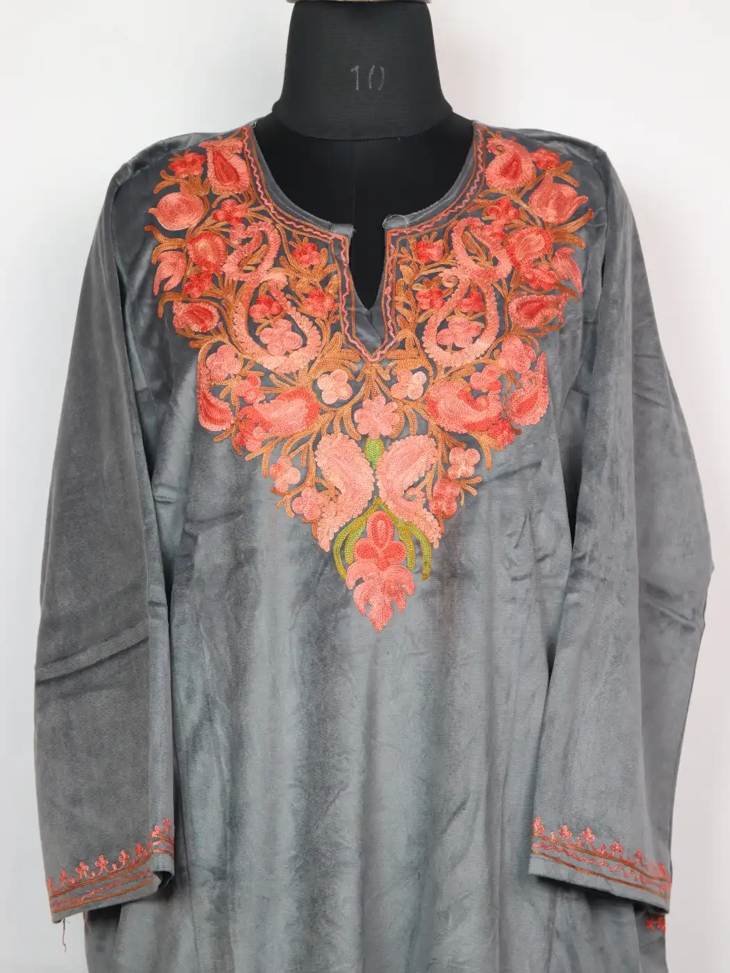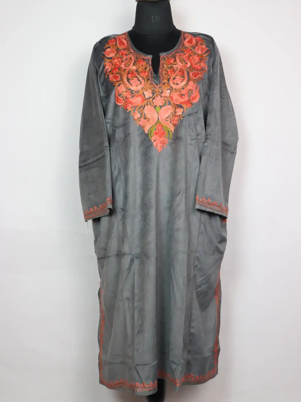 This pheran brings velvet softness with a little petal-like feel. Floral aari with badam motifs sits along the neck, and the 60 chest with 44 length offers space and pockets for comfort. It hugs you well and keeps you cosy through long hours. Simple and elegant.