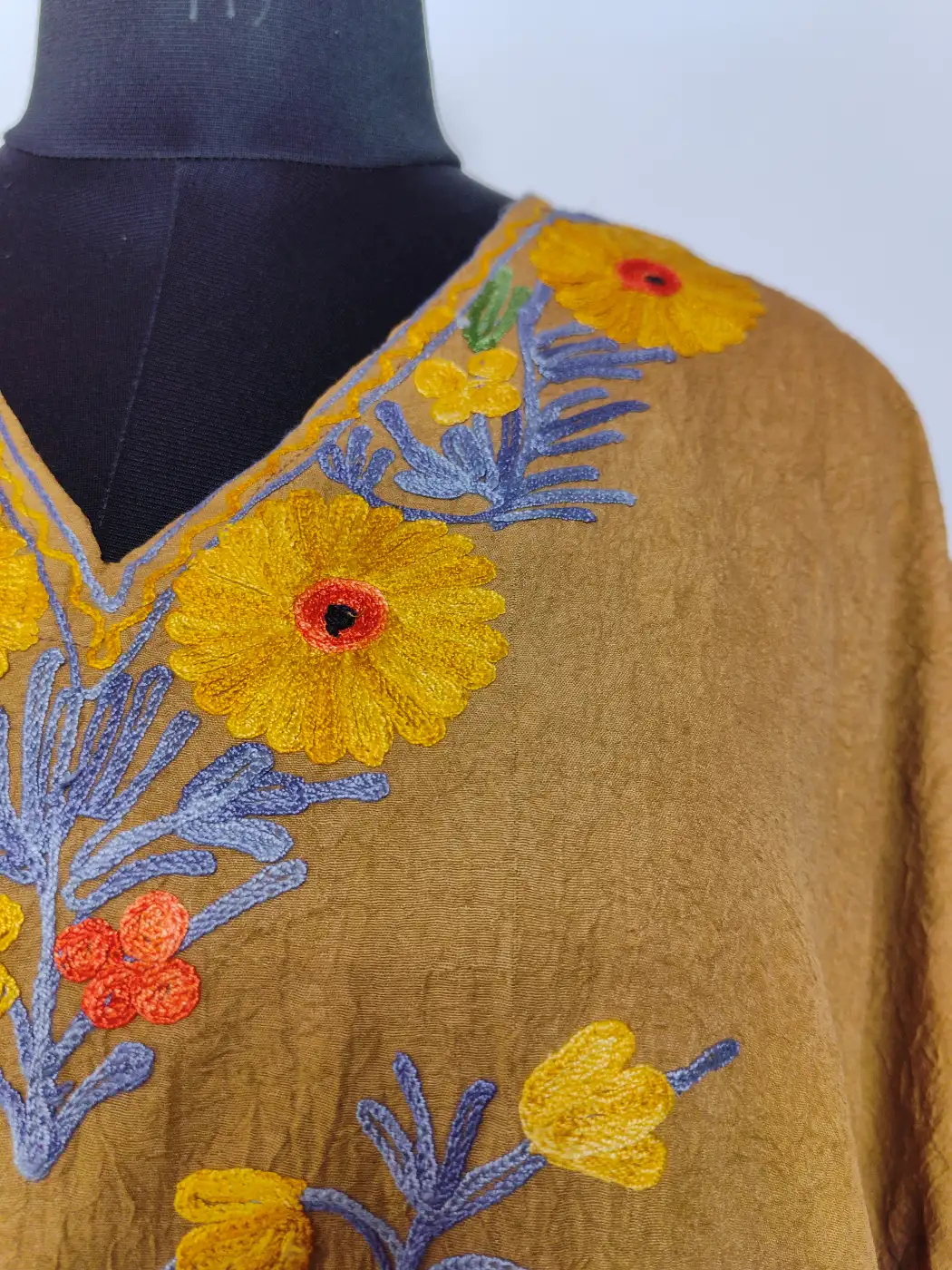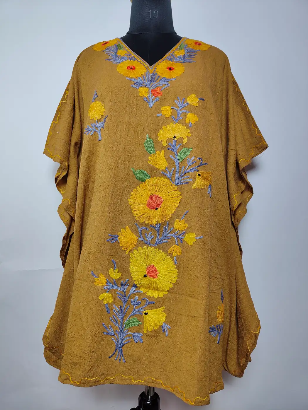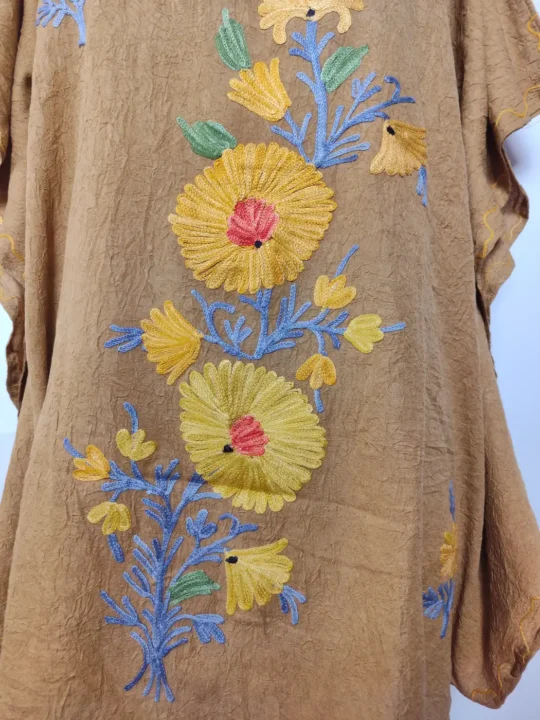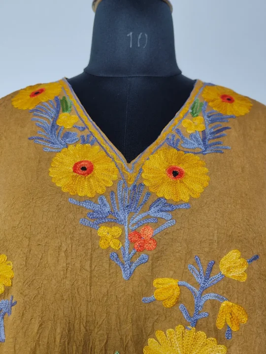 Floral aari embroidery at the neckline and front panel adds a delicate touch to this Kashmiri aari work kaftan dress. Made from brown crush cotton, it falls effortlessly with a relaxed flow, which gives you a comfortable outfit that blends everyday ease with a hint of traditional detailing.