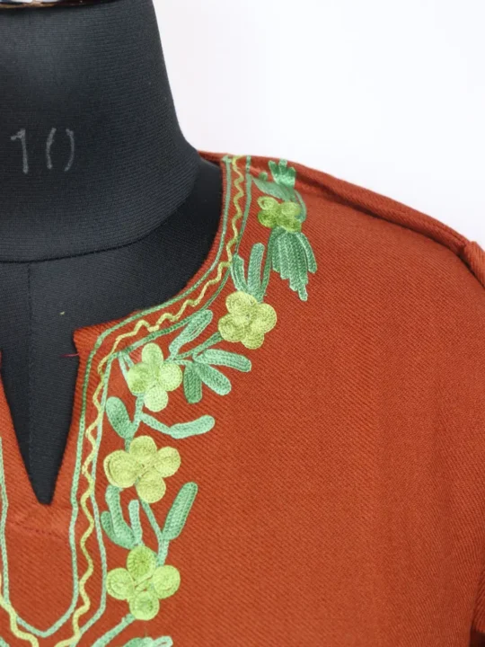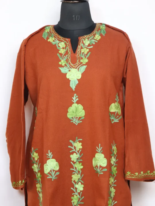 Elegant brown Cashmilon Wool and floral work across the neckline and booti and striped pattern on front panel define this Kashmiri Kurti Set with chest 48 inches chest size and length 43 to ensure a comfortable fit.
