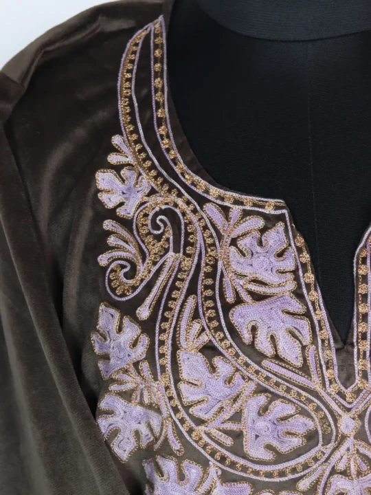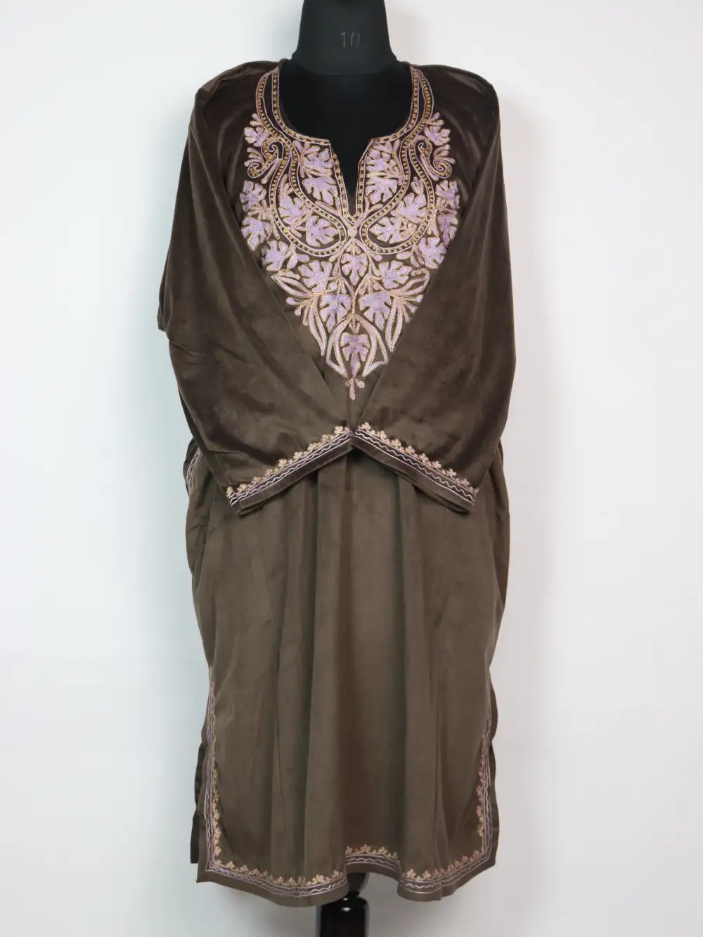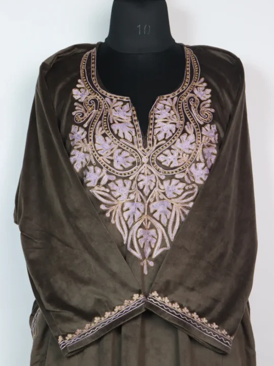 This brown colour phiran dress in Velvet features Zari Aari work at neckline in chinar-in-badam patterns and it comes with pockets both side for useful storage.