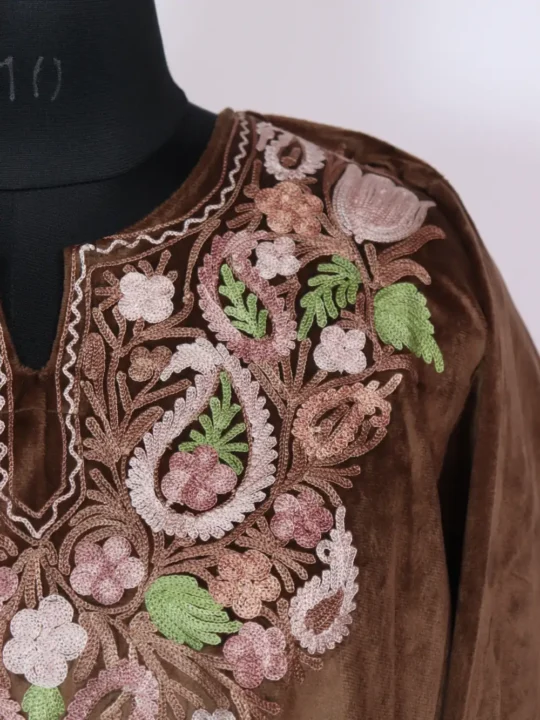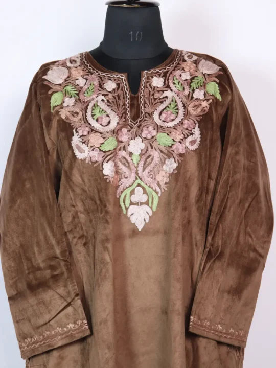 You can buy this phiran brown velvet pheran online with floral Aari embroidery at the neckline. Comes in 56 chest size and 44 inches length, this pheran offers Kashmiri stitch detail and a comfortable fall