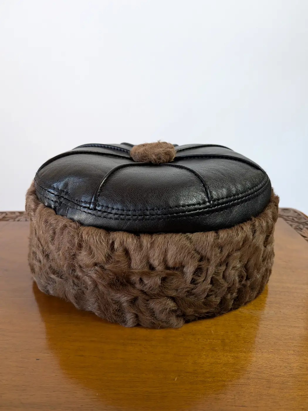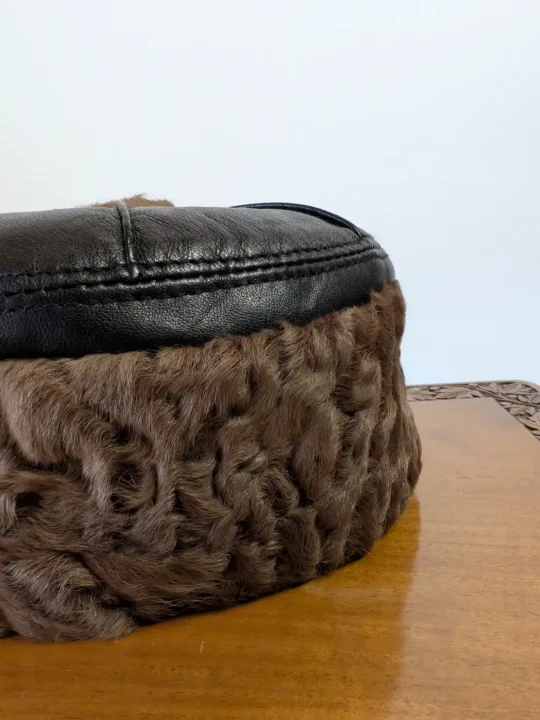Rooted in the historic style of the Valley, this pure wool round brown Karakul cap lends an air of quiet dignity. Whether worn with a pheran or any attire, its fine making always gives it a strong, refined presence. This premium Kashmiri cap features a pure black leather top with stripes which creates six panel design on it and a decorative woolen center. Made in Srinagar Kashmir, this brown and black cap makes a graceful addition to any winter wardrobe—especially for young men who are drawn to culture and tradition.