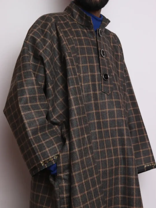 A brown check Stylish kashmiri tweed pheran cut in Tweed wool offers steady warmth and refined simplicity, it comes with chest size 68 inches and length 44 inches ensure easy layering. This pheran keeps styling straightforward and brings a calm Kashmiri presence to everyday winter wardrobes.
