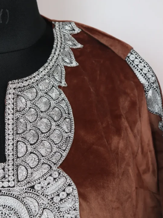 Velvet kashmiri phiran set in green includes pheran, trouser and dupatta and it shows Zari Tilla embroidery at the neckline and outline sleeves in floral and continuous motifs. It has chest size 59 inches and length 43 inches offer a flowing fit.
