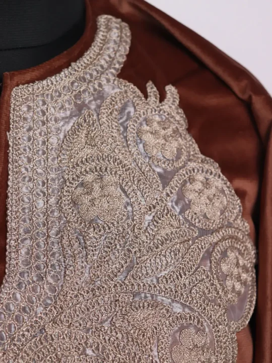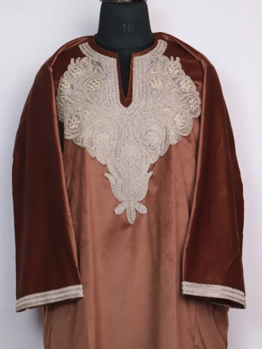 Plush holland velvet in brown hue and Zari Tilla floral badam neckline embroidery define this Kashmiri Pheran. It comes with both sides pockets for practical wear, and the Pheran pairs velvet warmth with silver metallic threadwork so the neckline becomes the refined focal point..