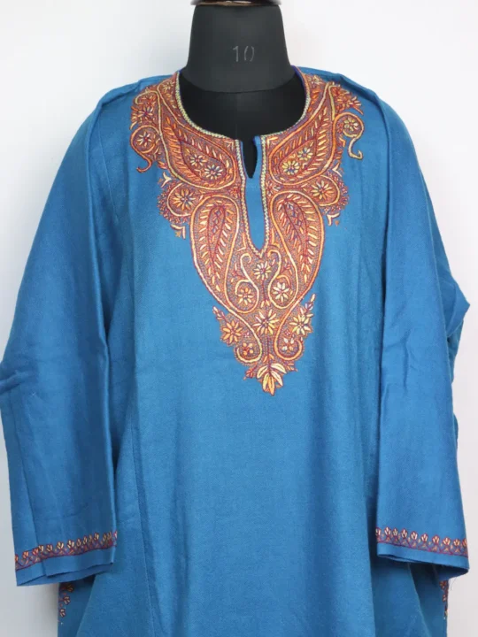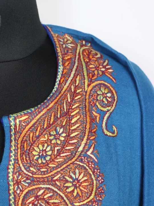 Raffal wool fabric and delicate sozni badam motifs at the neckline shape this blue kashmiri phiran, Its chest size 55 inches and length 43 inches provide generous room.