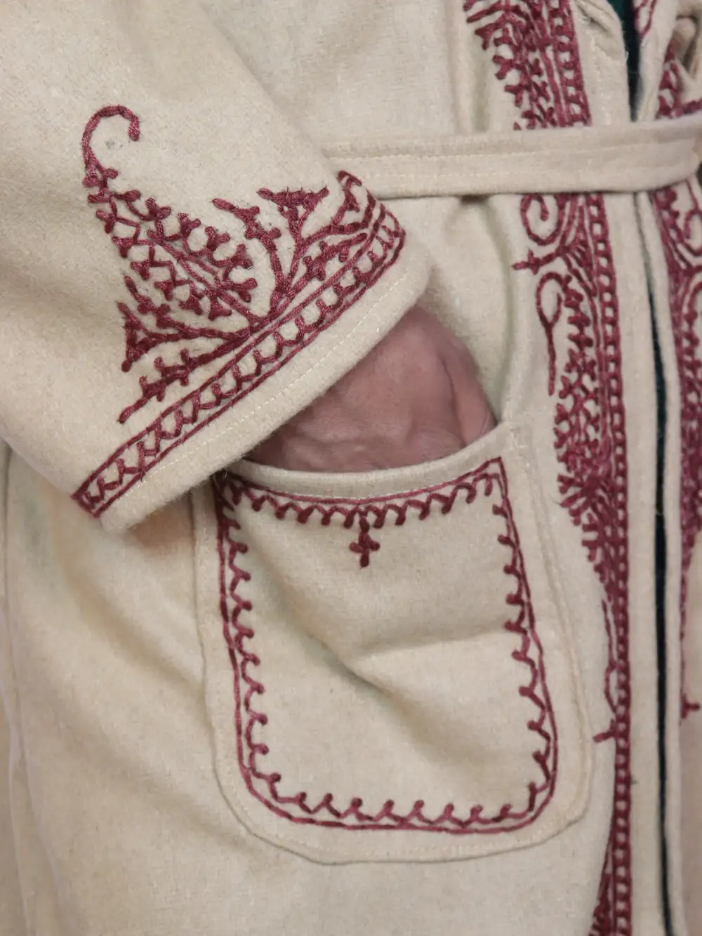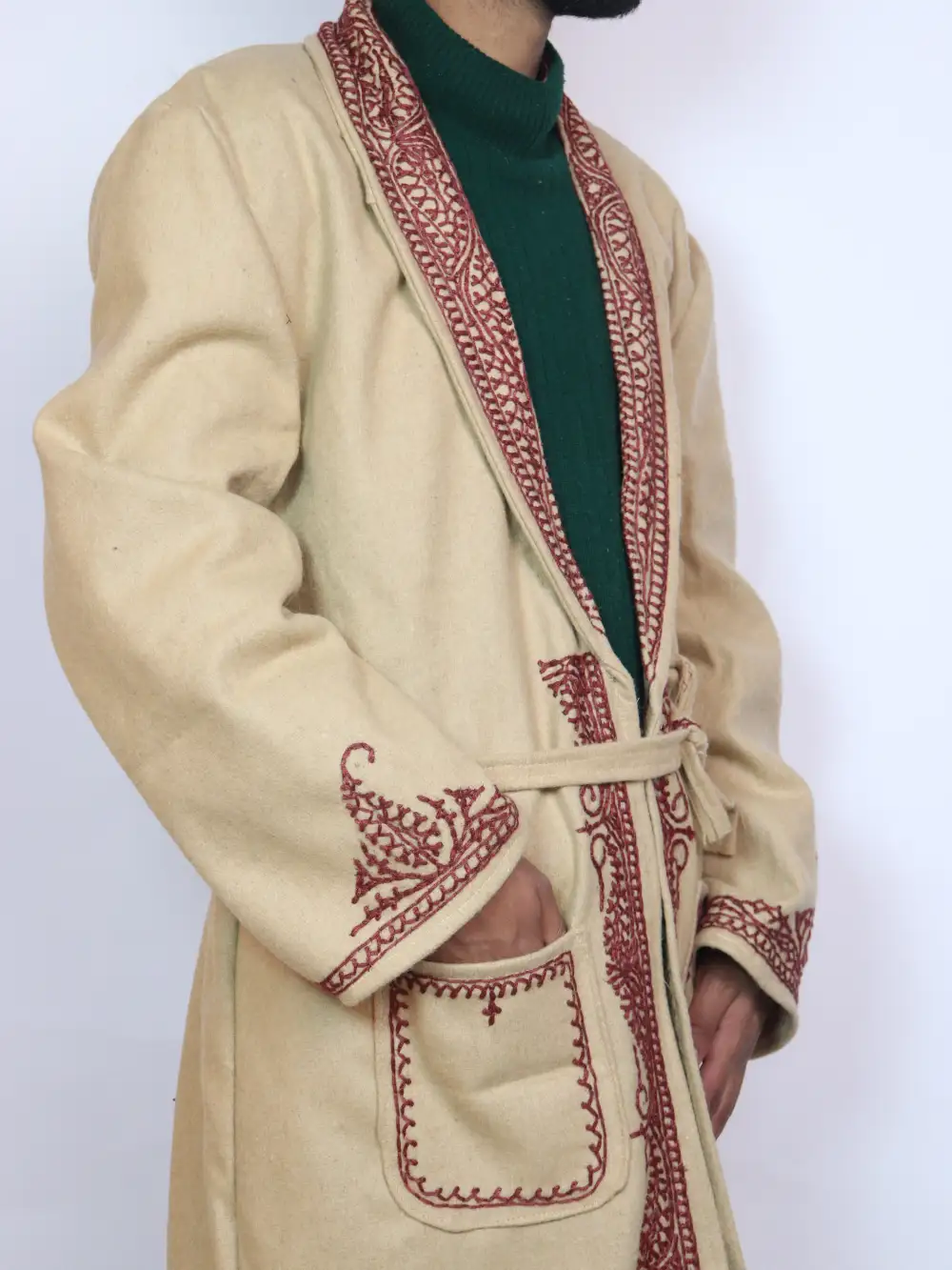 Carefully handcrafted in tweed wool, this embroidered gown shows hand Aari floral on front side, collar, pockets and sleeves. It comes with chest size 46-50 inches and length 49 inches that ensures comfort. This aari embroidered gown feels artisanal and Kashmiri in spirit, and the belt included lets you shape it.