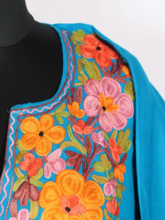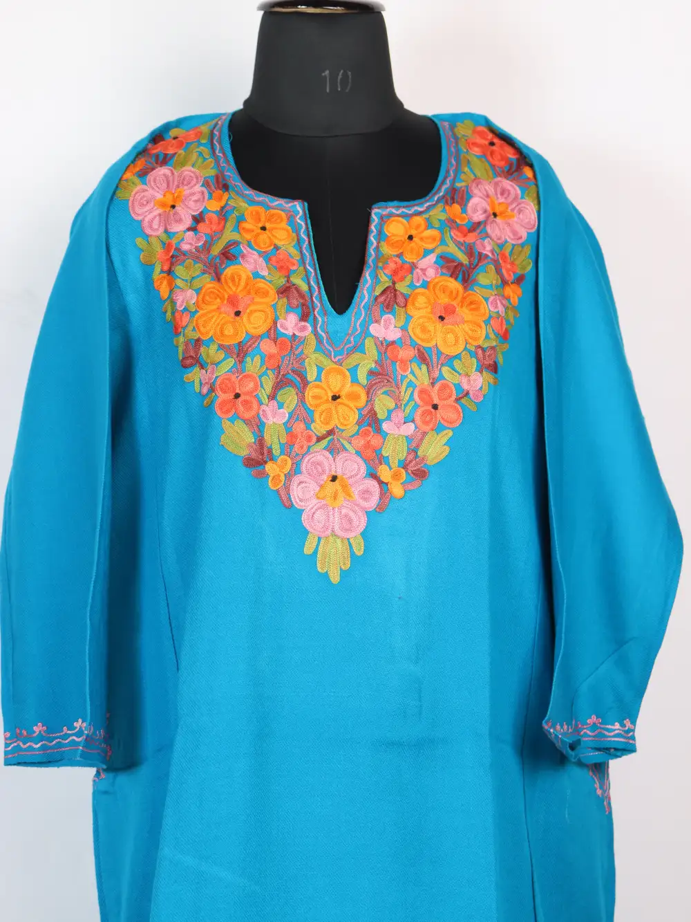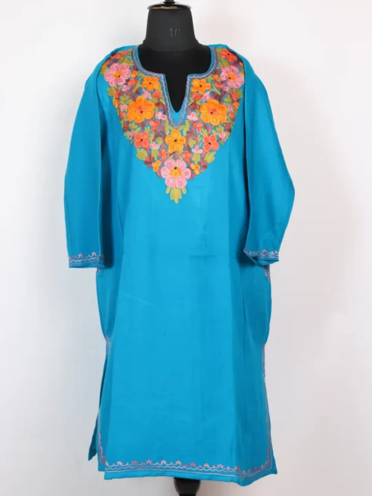 Crafted in cashmilon wool, this blue pheran is made to feel both cozy and stylish. The neckline features Aari embroidery in mustard and purple floral and green leaf patterns, offering a gentle accent that enhances its look. Its fabric keeps you comfortable throughout the season, while the embroidery adds a touch of femininity. It is perfect for daily use or casual outings, it creates a balance of simplicity and beauty.