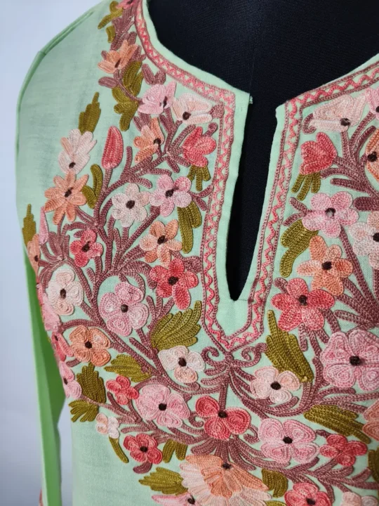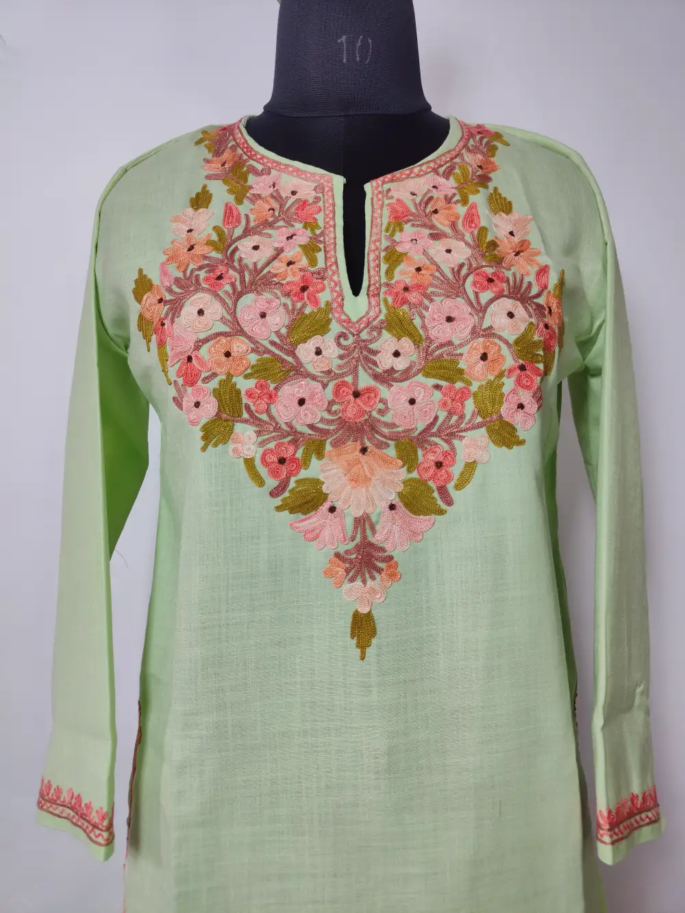 Designed in soft ruby cotton, this sage green color kurti set includes both top and bottom for a complete look. The neckline has been highlighted with Aari embroidery in red, pink and green hue shaded floral motifs, that give it a refined detail. It has been made light and breathable, yet stylish, it is perfect for summer or transitional weather. This set blends simplicity with elegance, makes it a practical yet charming addition to your wardrobe.
