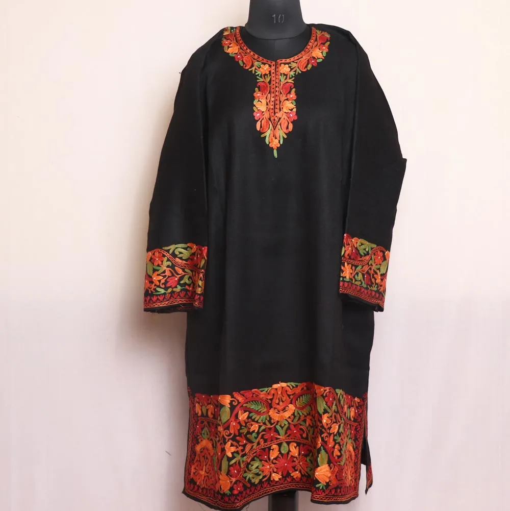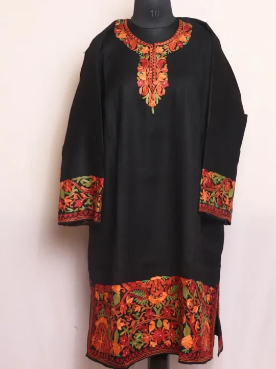 Black Raffal Wool Pheran from the Firdous Collection, crafted with heavy sleeve and border embroidery for a luxurious look. Made from premium Raffal wool, this elegant pheran offers exceptional warmth and comfort, featuring a 48-inch chest, 40.5-inch length, two side pockets, and intricate Aari work. Perfect for women who appreciate fine detailing, this standout piece blends traditional Kashmiri craftsmanship with a modern, sophisticated touch—making it a must-have addition to your winter wardrobe.