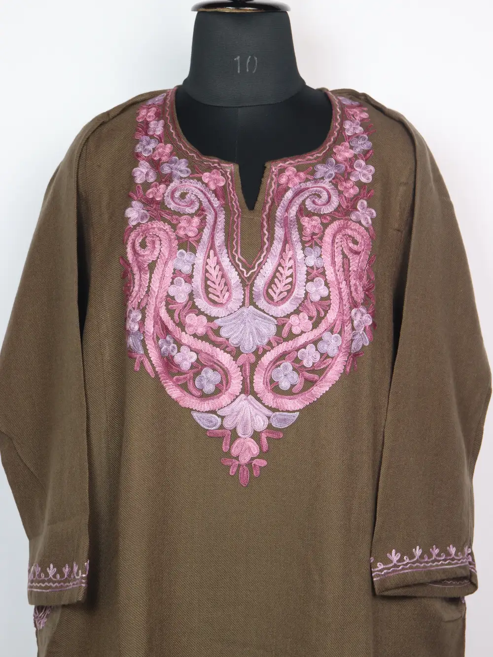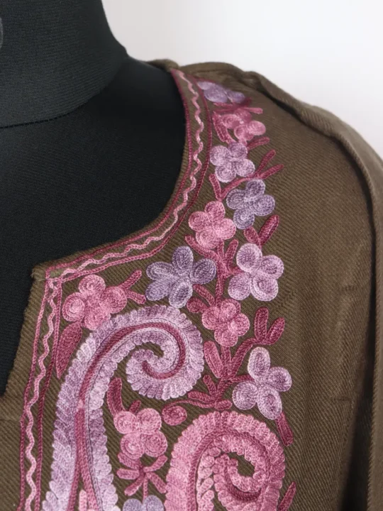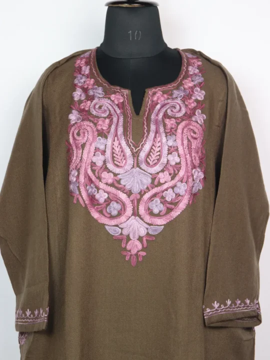 Kashmiri beige colour pheran shows Aari embroidery at the neckline with badam and flowers. It includes pockets on both side for handy storage. It reflects a calm Kashmiri mood while remaining easy to wear.