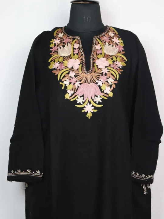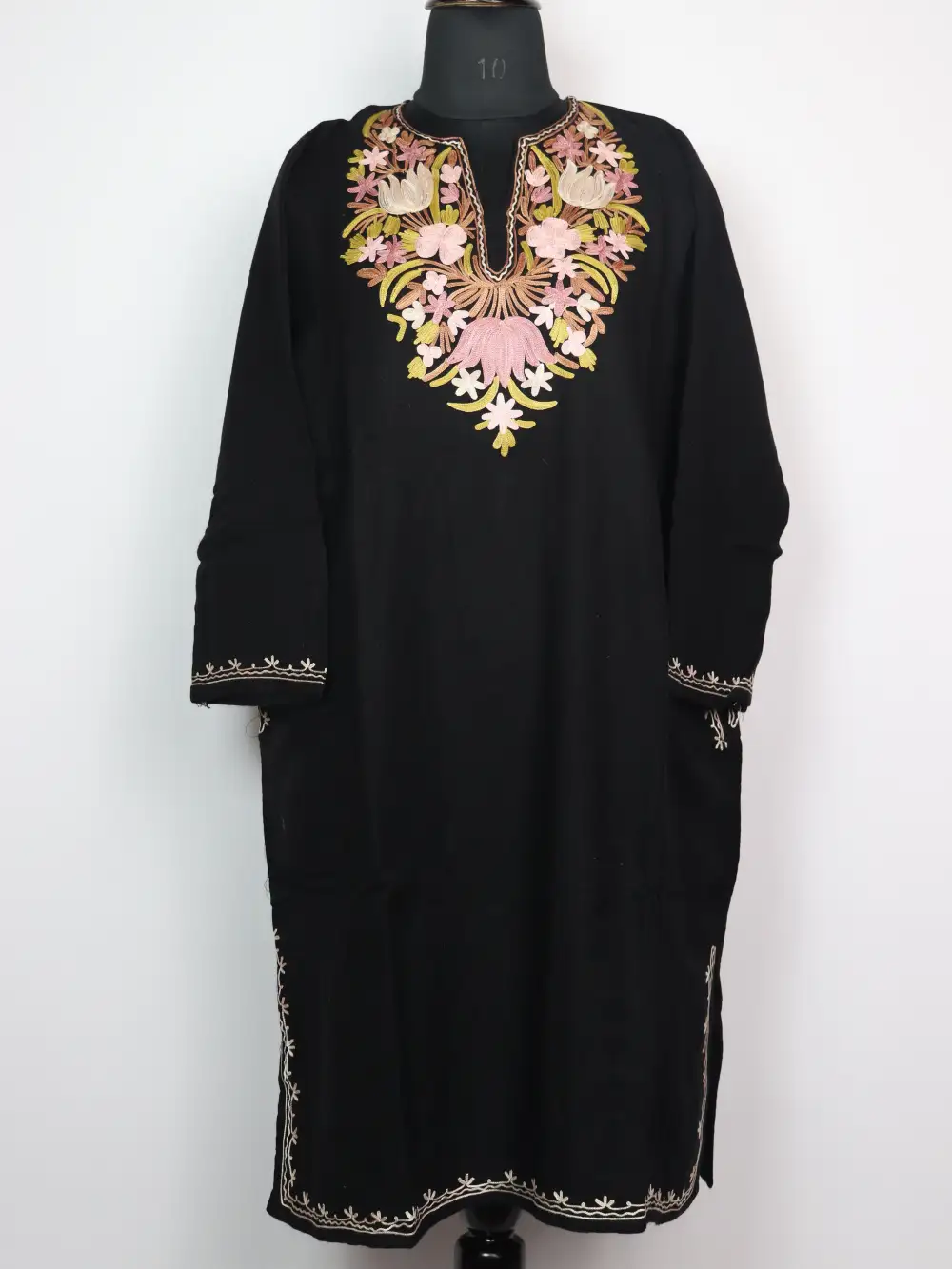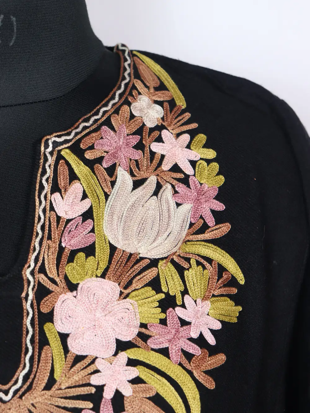 Kashmiri black colour pheran crafted in cashmilon wool fabric, carries Aari embroidery at the neckline where layered florals have been stitched into rhythmic motifs. It comes in chest size 53 and length 42 inches to create a generous fall.