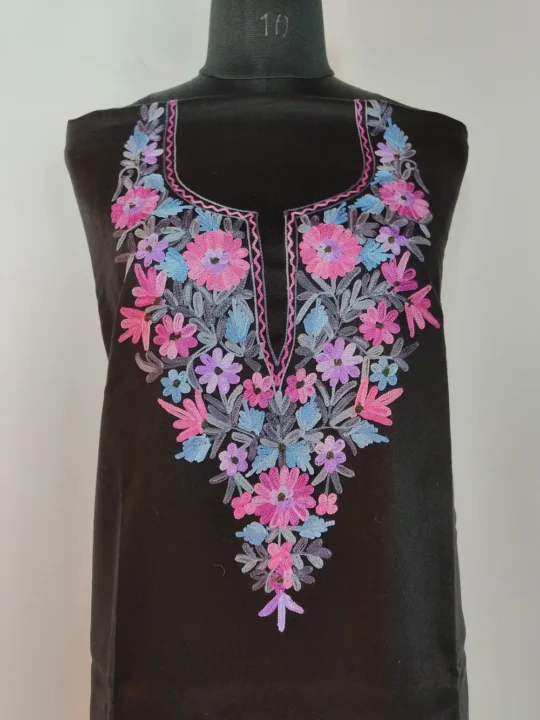 A black colour salwar kameez 2pc suit in Cashmilon Wool shows floral aari embroidery at the neckline and border. It comes as a 2pc set with salwar and kameez unstitched for custom stitching.