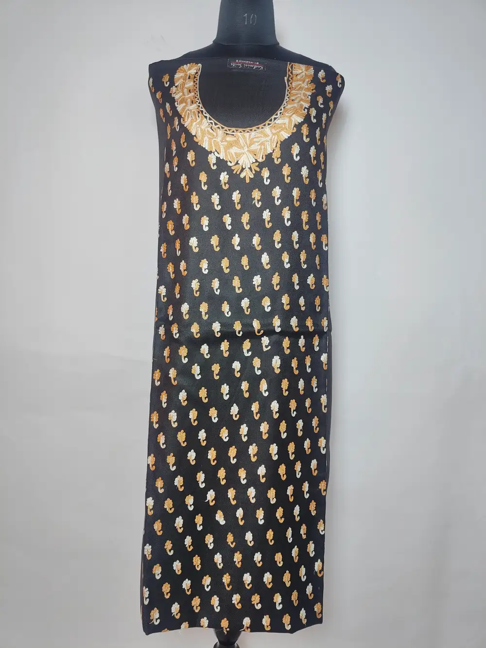A black hue dress material for 2pc suit in Cashmilon Wool features all-over booti embroidery. It is offered as a 2pc set with salwar and kameez which come unstitched for tailoring to fit.