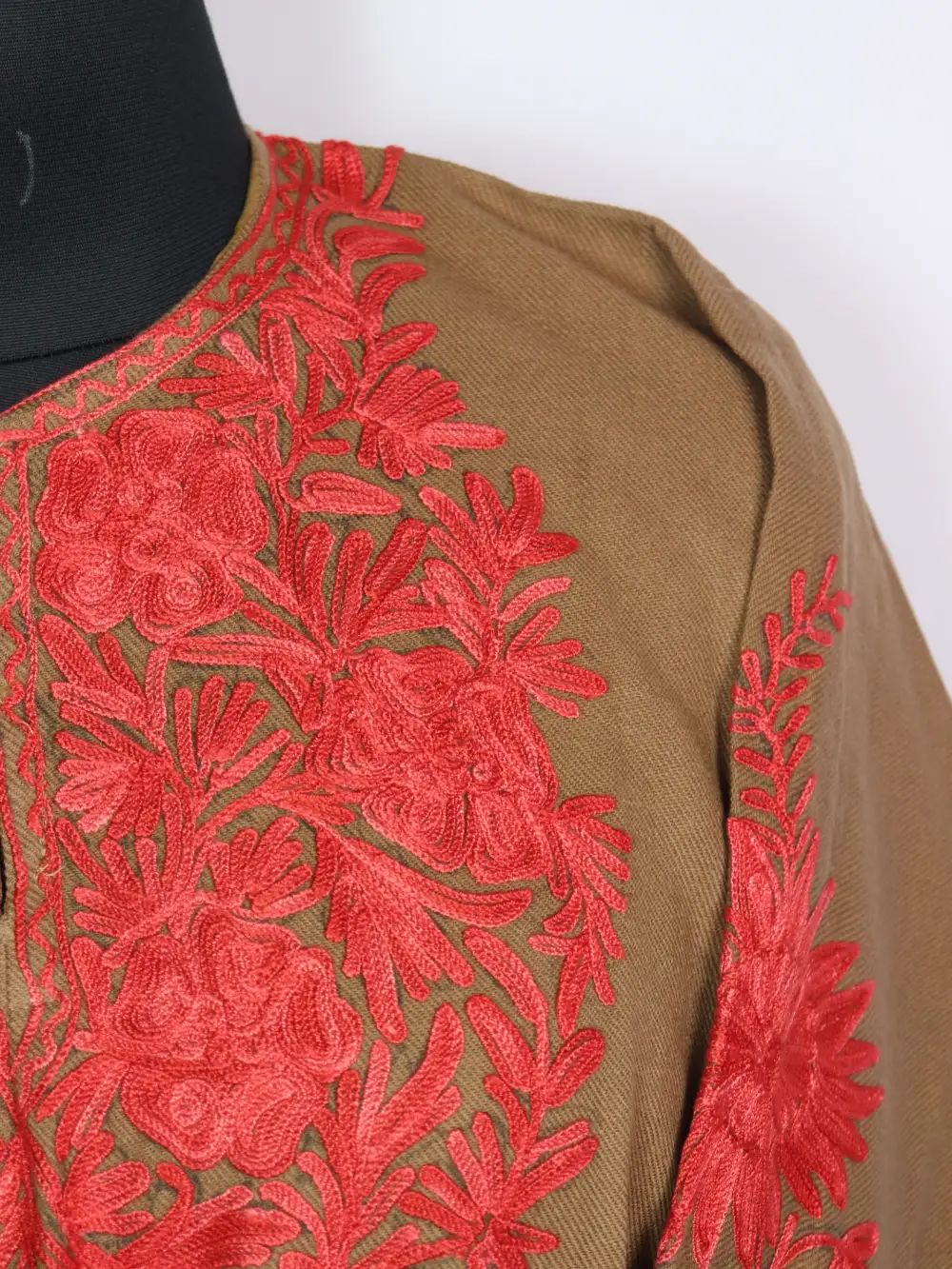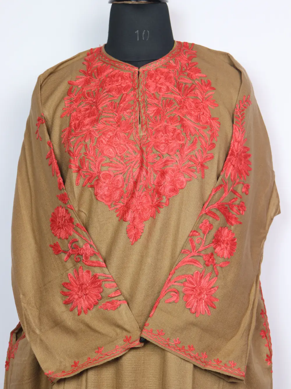 A brown colour Kashmiri phiran features Aari embroidery at the neckline and sleeves composed into layered flower clusters that add subtle texture. It comes with chest size 50 inches and Length 41.5 to deliver generous, comfortable proportions.