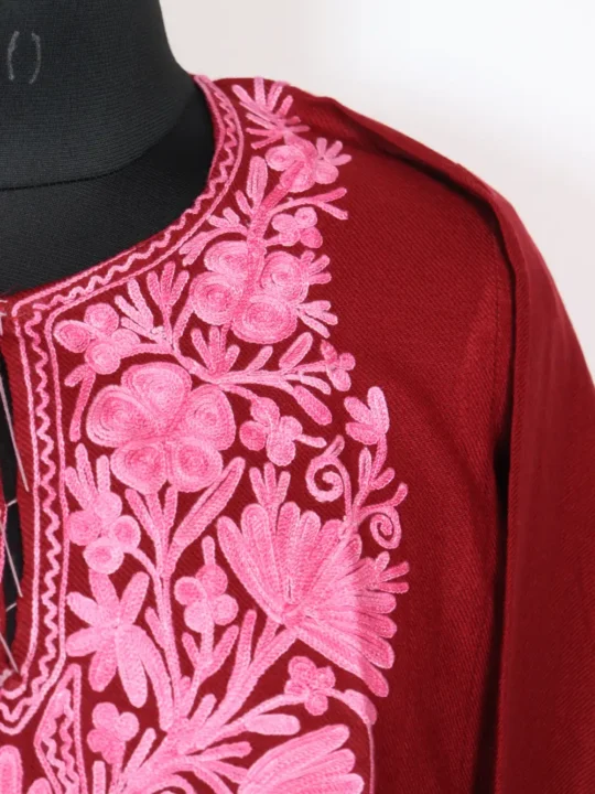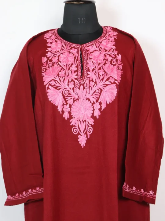 Find this elegant maroon Pheran when you search phiran online— it pairs Cashmilon wool with floral Aari kadhai at the neckline. This maroon Pheran includes pockets on both sides for practical use.