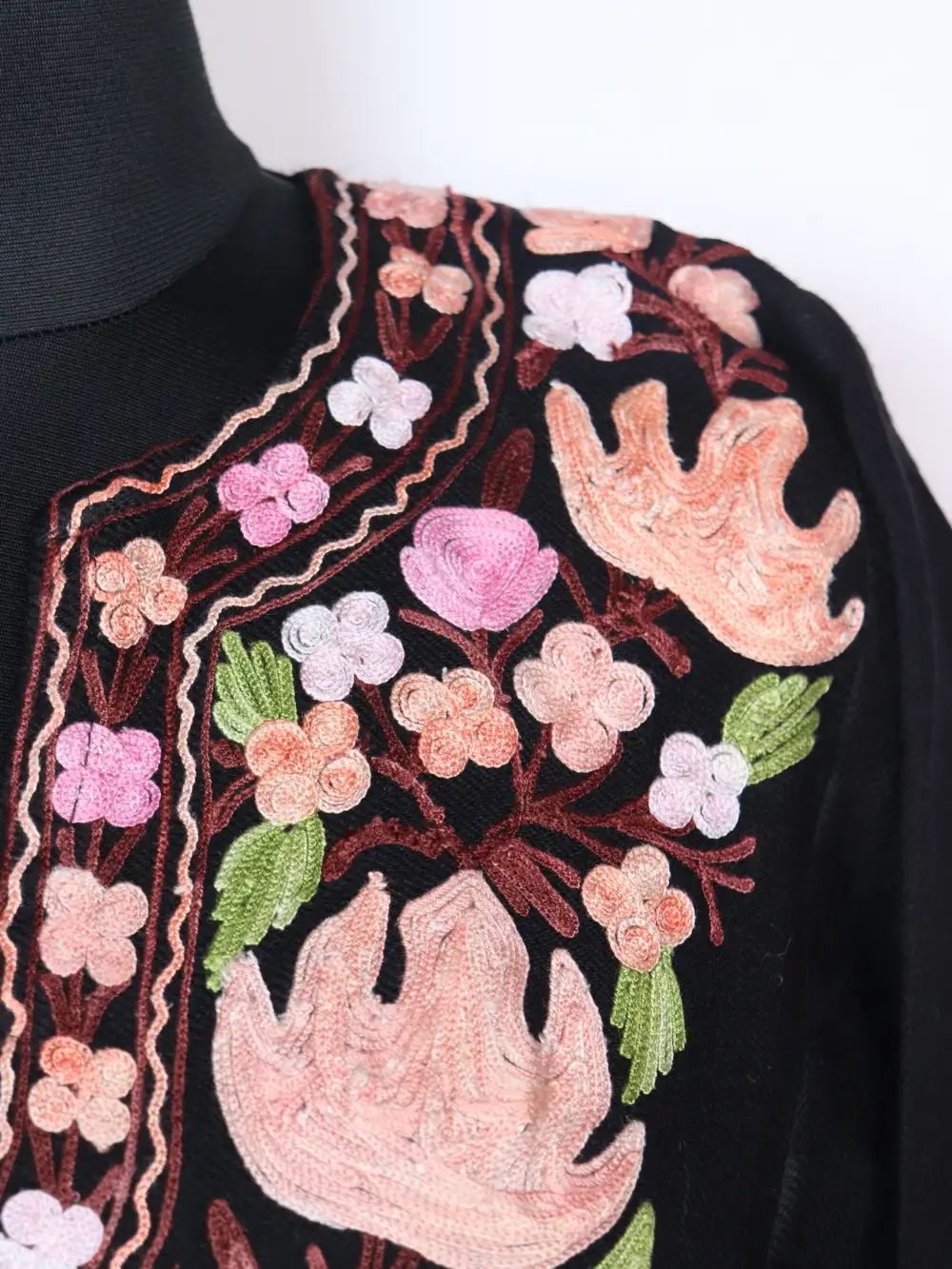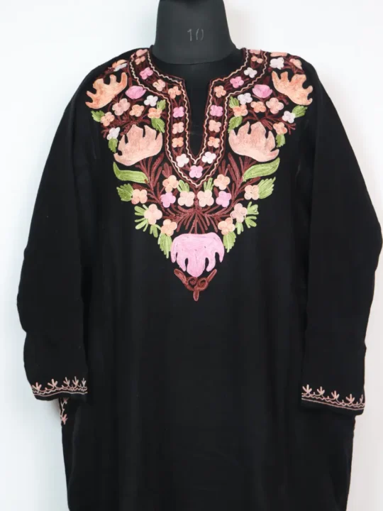 Cashmilon wool crafted black phiran enriched with Aari embroidery in floral motifs done at neckline. It has chest size 52 inches and length 45 inches that drapes softly.