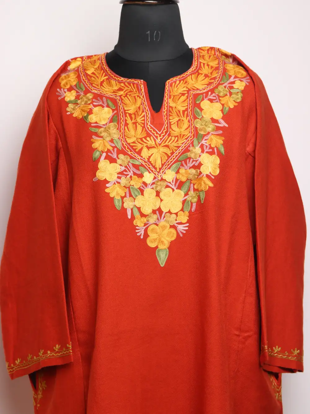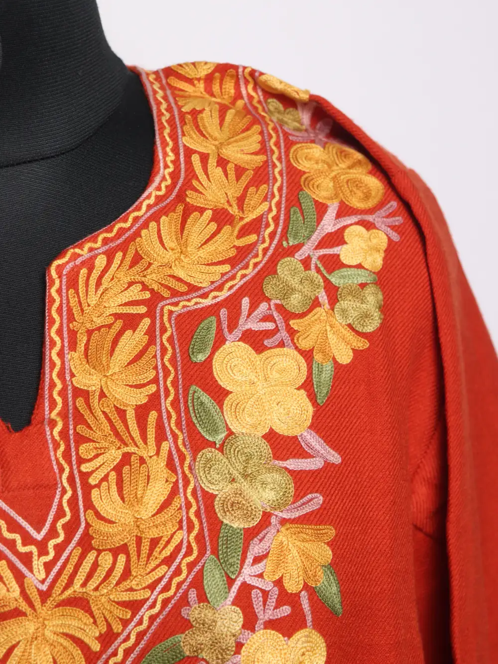 Jashn-e-Rekhta classic pheran kashmiri cut in cashmilon wool shows floral Aari embroidery at the neckline.
