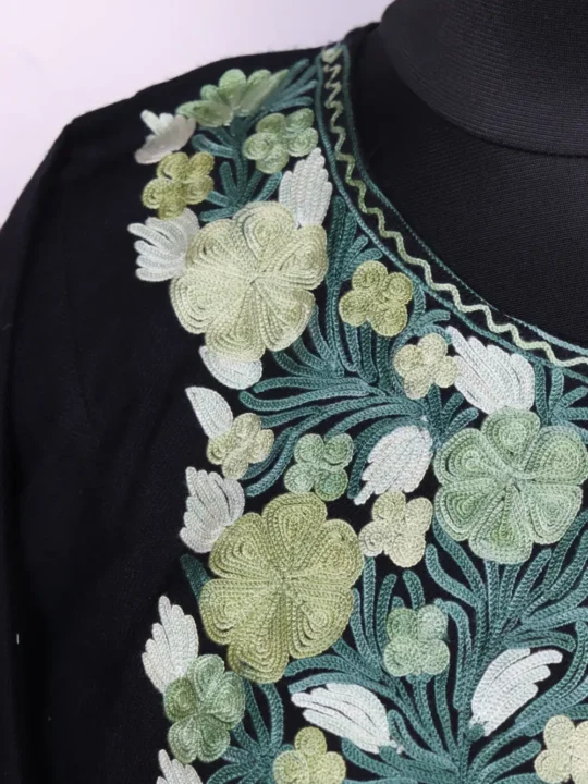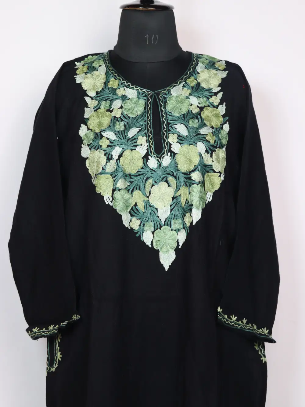 A black colour Kashmiri traditional phiran dress in Cashmilon Wool shows Aari work at the neckline ibn floral motifs. It includes pockets on both sides for usefulness.