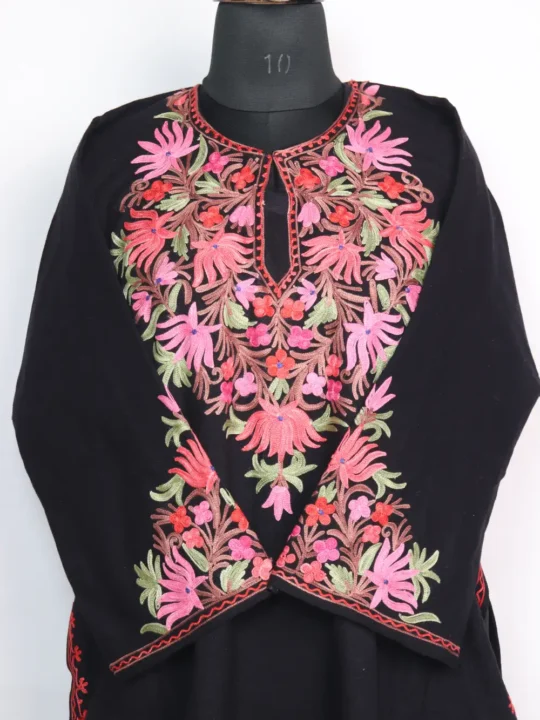 Add a touch of grace to your winter wardrobe with this black Cashmilon pheran featuring intricate Aari floral embroidery around the neckline and sleeves. It has a chest size of 52 inches and a length of 44 inches.