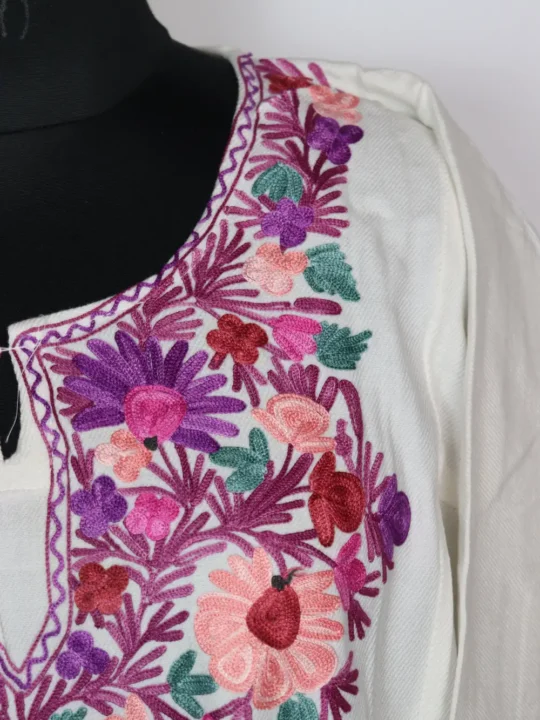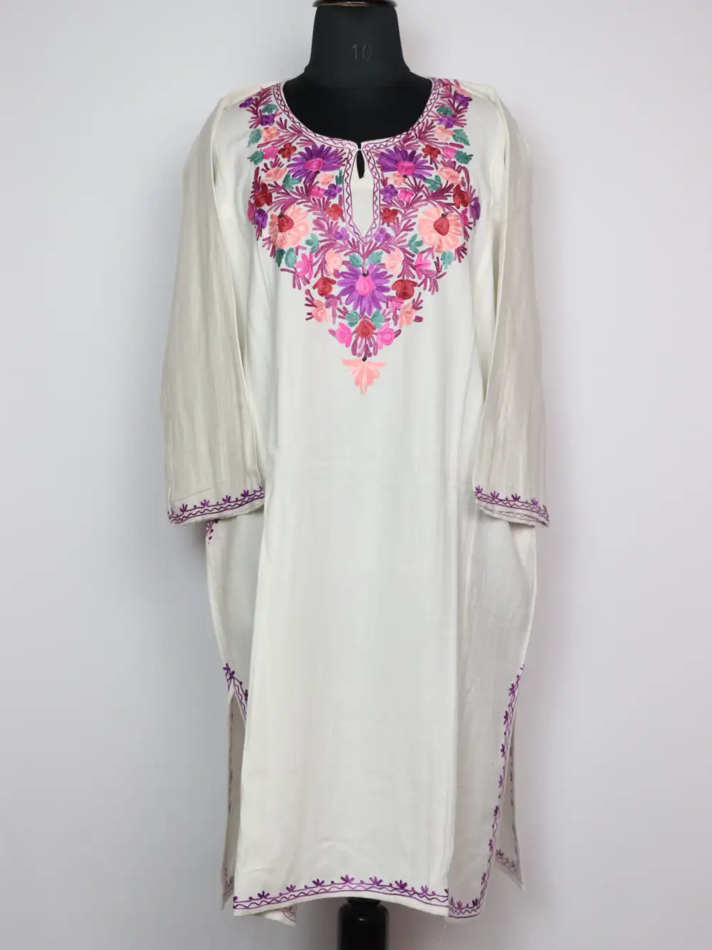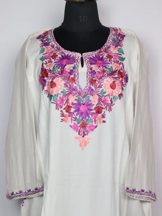 This cashmilon wool faran features detailed floral Aari kadhai around the neckline which gives it a natural and decent touch.