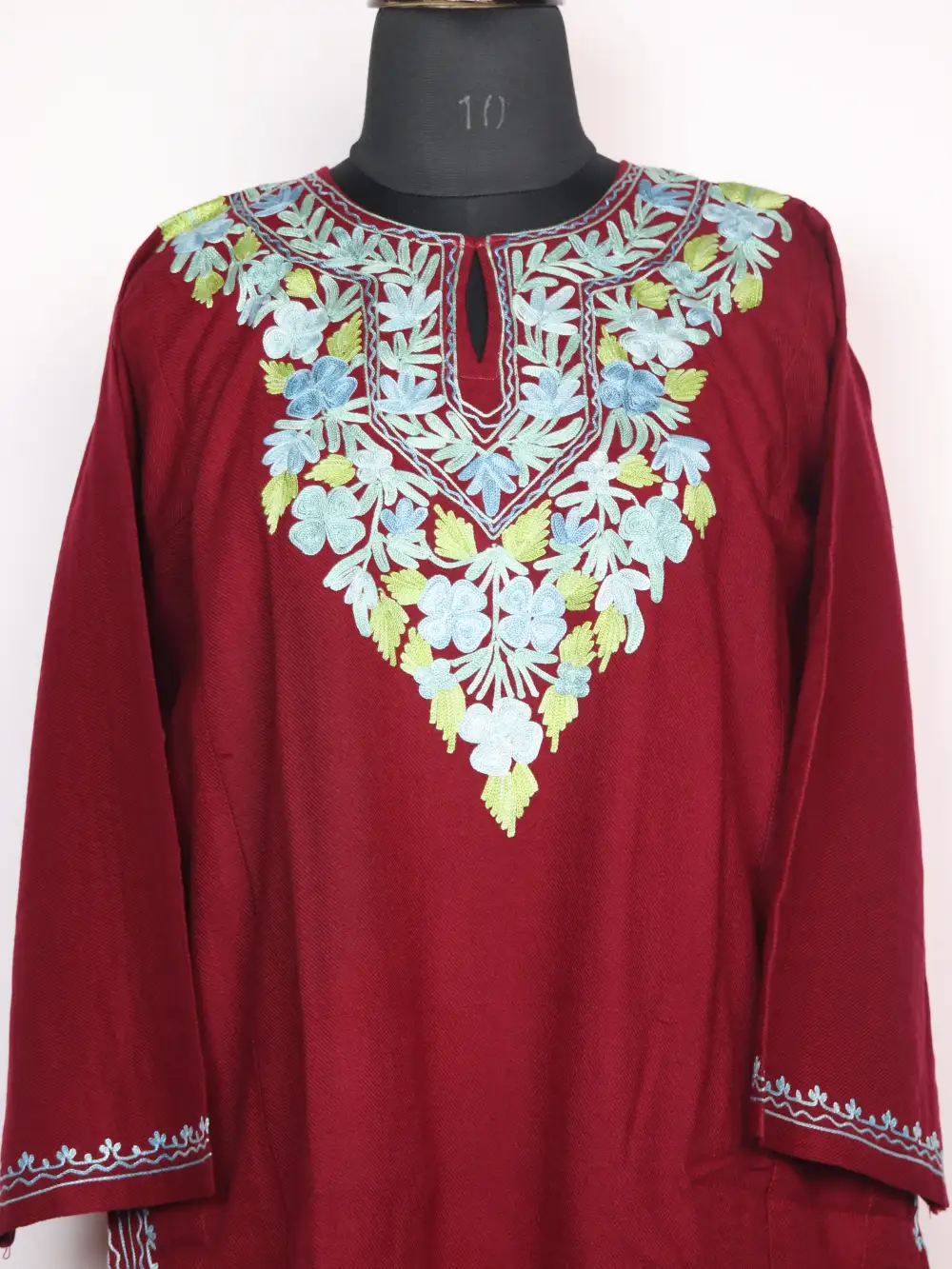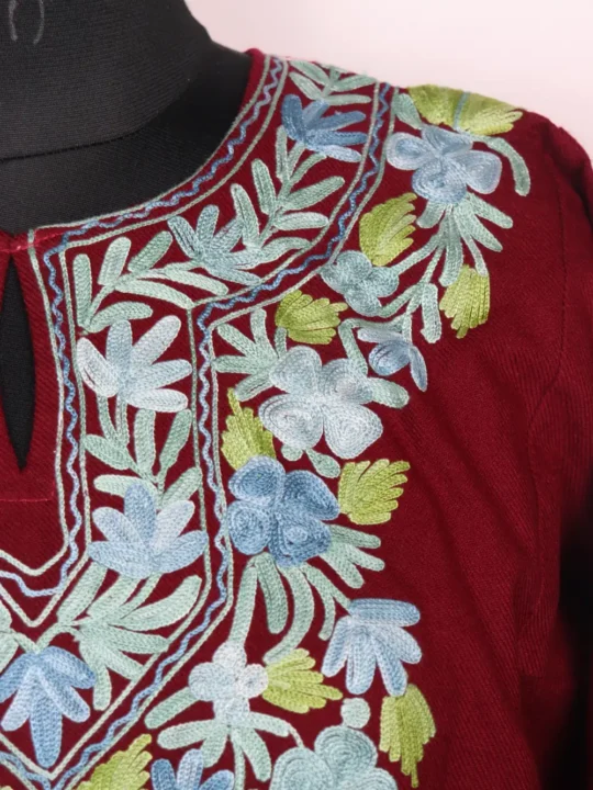 The neckline has neat Aari colorful floral embroidery that enhances the soft Kashmiri touch.