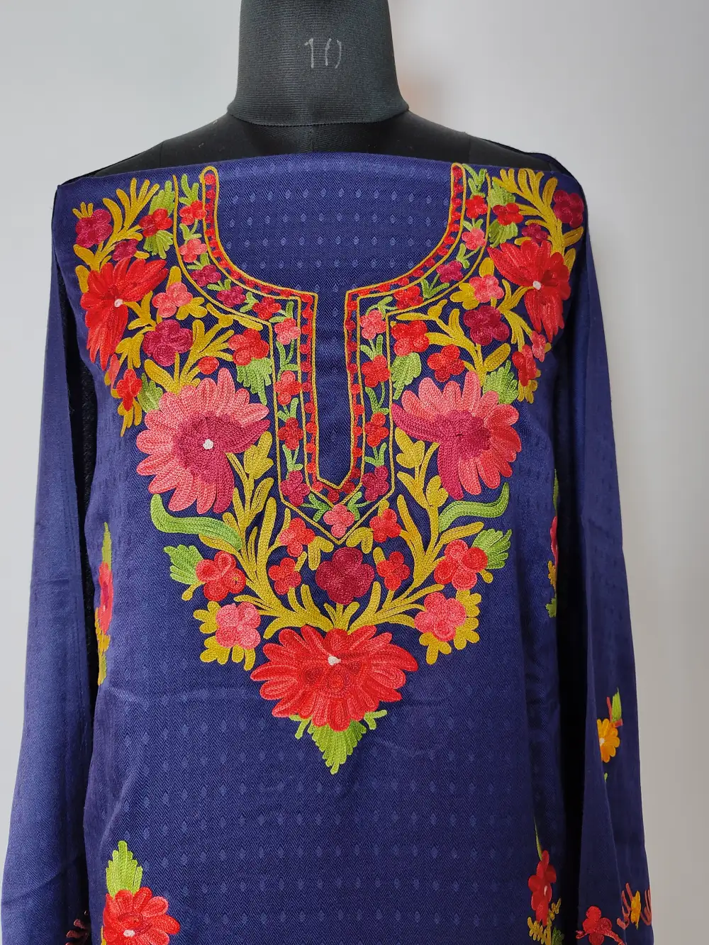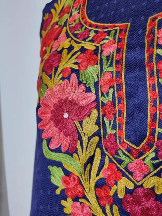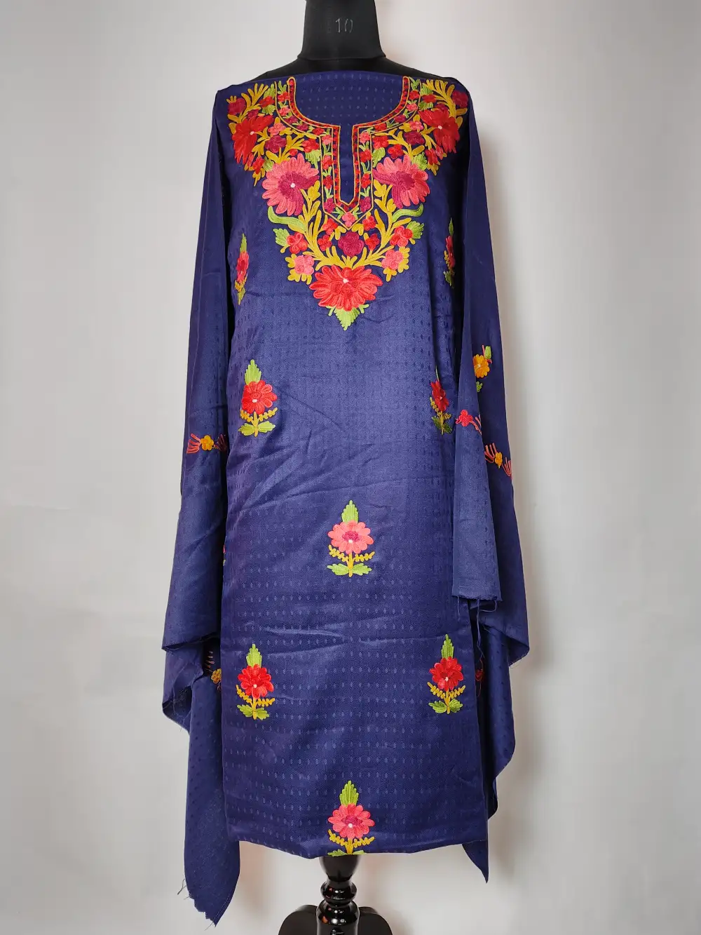 Cashmiolon wool 3pc salwar suit in dark blue is styled with aari work at the neckline in floral patterns and front panel styled with bootis. It is offered as a 3pc set — salwar, kameez and dupatta which you get unstitched so that you can stitch to your fit.