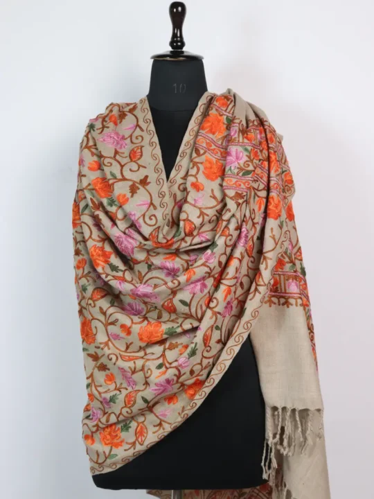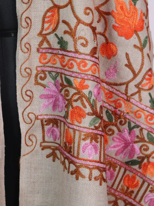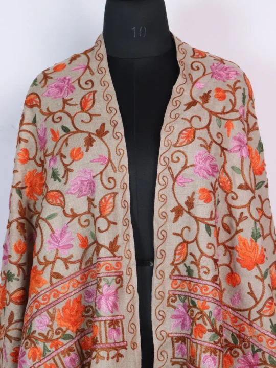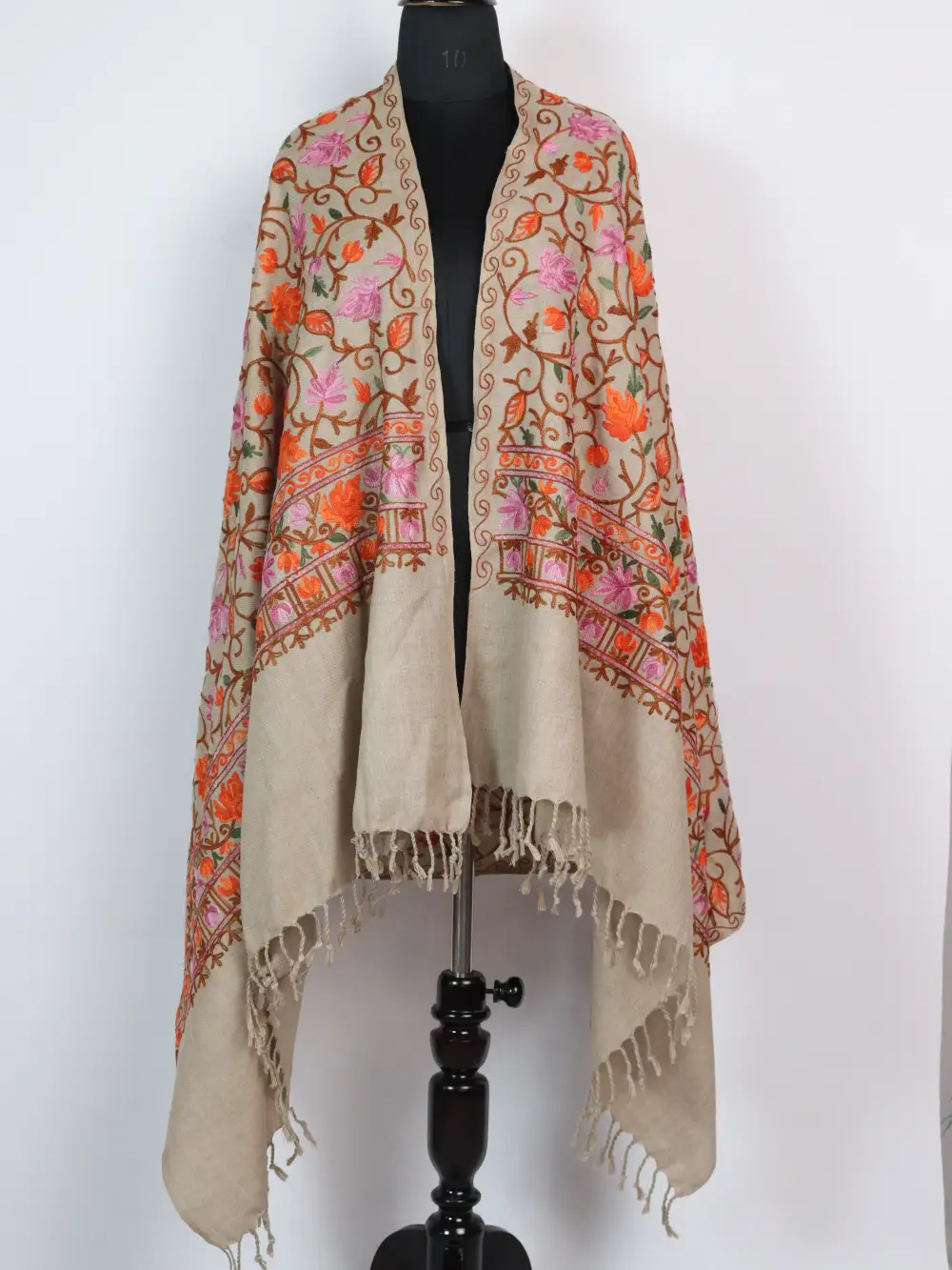 This beige color shawl in cashmilon wool carries elegance with its all-over embroidery. This fabric is light yet warm, while the design is made special with pink-oranhe chinar with floral vine motifs spread across it. The parallel borders are finished with continuous work, which givesit a timeless finish. It is perfect for adding grace to winter dressing, it blends coziness with artistry in a way that feels refined.