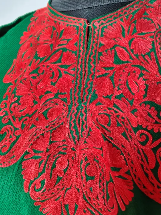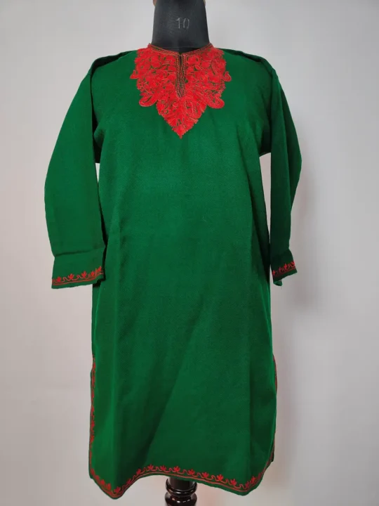 Cashmilon wool fabric carries red floral and badam Aari embroidery along the neckline of this green short pheran, which gives it quiet charm. Priced at ₹1299, it’s an affordable winter piece which bring both comfort and colour to your everyday wardrobe. It is 36 inches in length, it’s light, warm, and easy to wear. Its soft texture feels pleasant all day.