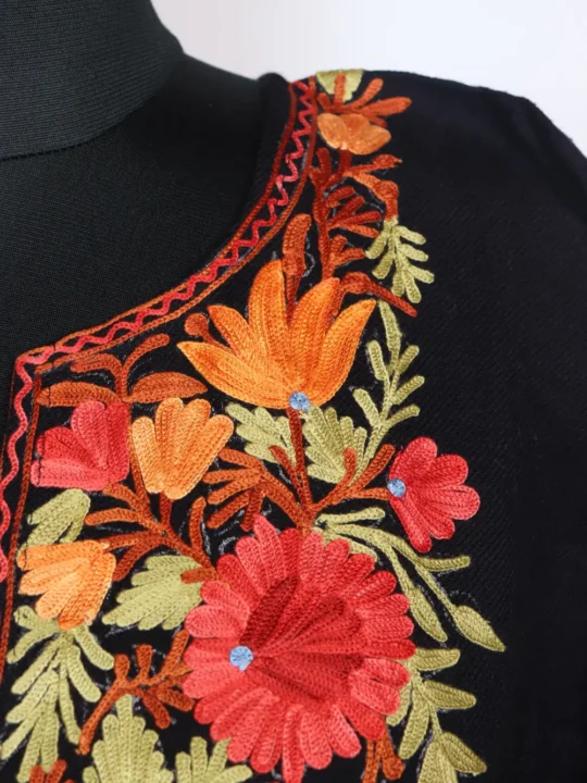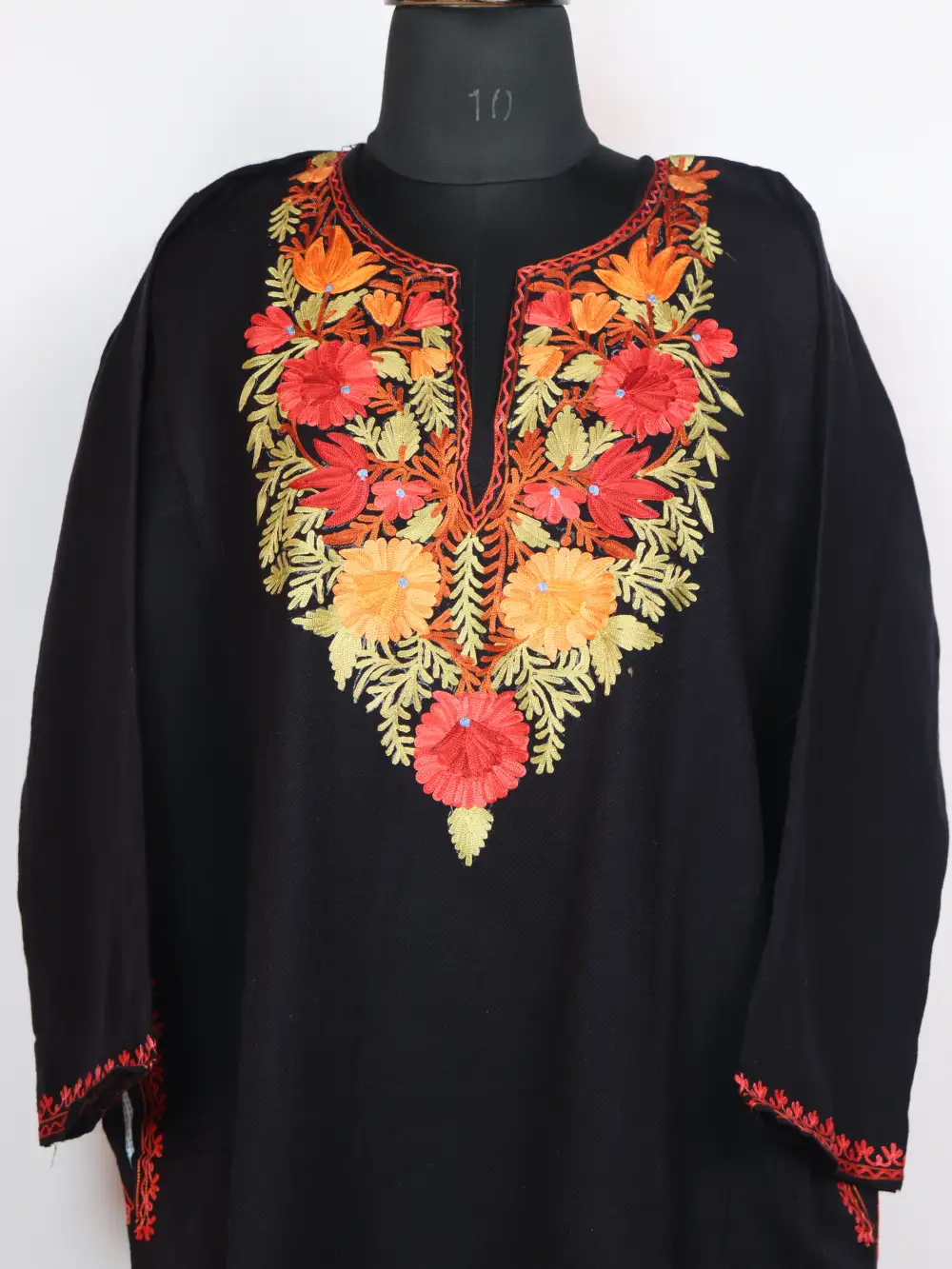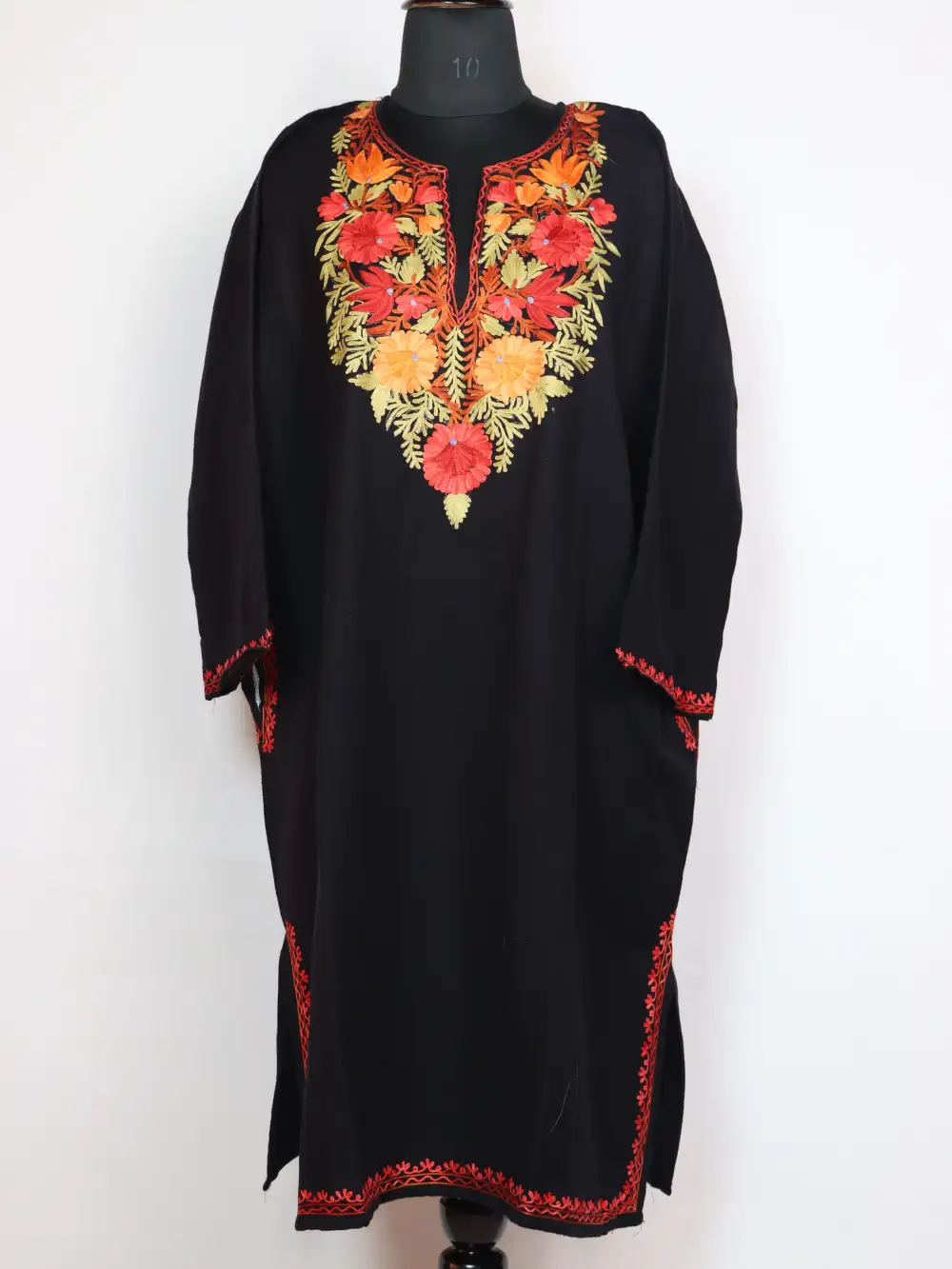 A black Kashmiri firan/pheran dress in Cashmilon Wool carries Aari embroidery at the neckline in floral patterns. It comes with pockets both sides for everyday practicality.