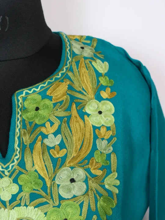 Cashmilon wool in sea green and Aari kadhai enhanced with floral motifs at the neckline give this Kashmiri kurti a composed, warm touch. Its chest size is 43 inches and length 40 inches ensure a comfortable fall.
