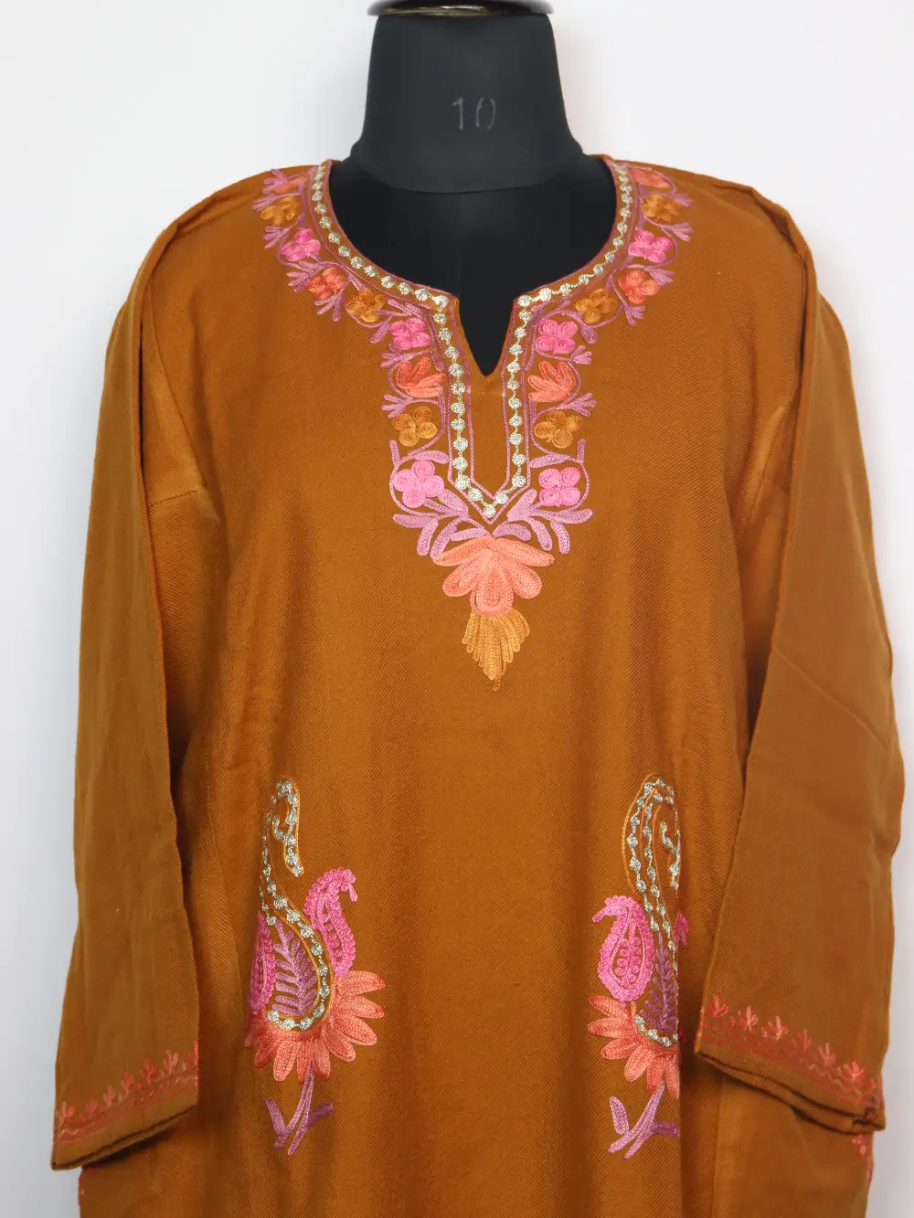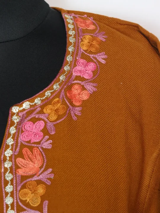Cashmilon wool gives rhis mustard colour Kashmiri phiran dress a smooth winter flow. Its floral aari and zari embroidery enhances the neckline and front panel with bootis.