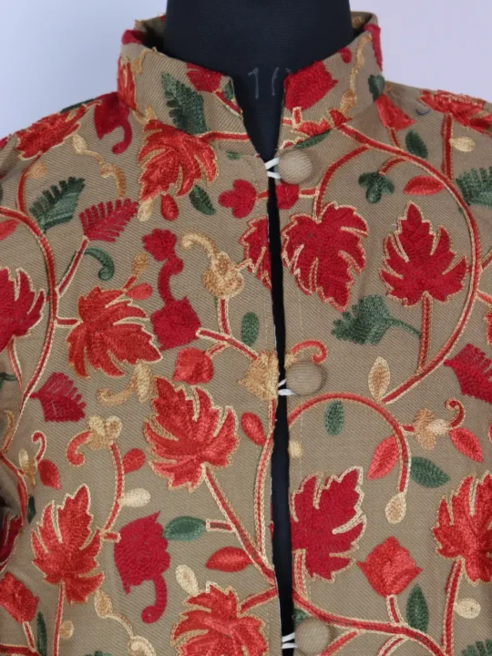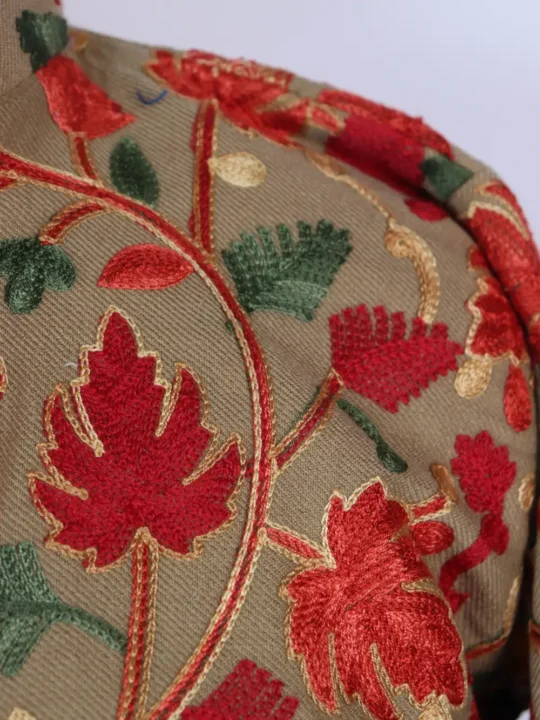 This beige coat in cashmilon wool feels warm yet graceful, it carries a design that celebrates timeless style. The surface has been highlighted with Aari embroidery features chinar motifs and green leaf motifs stitched delicately in red threads. It is comfortable to wear and versatile for winter days, it pairs beauty with practicality. It is a dependable garment, it adds effortless refinement to a woman’s seasonal wardrobe.
