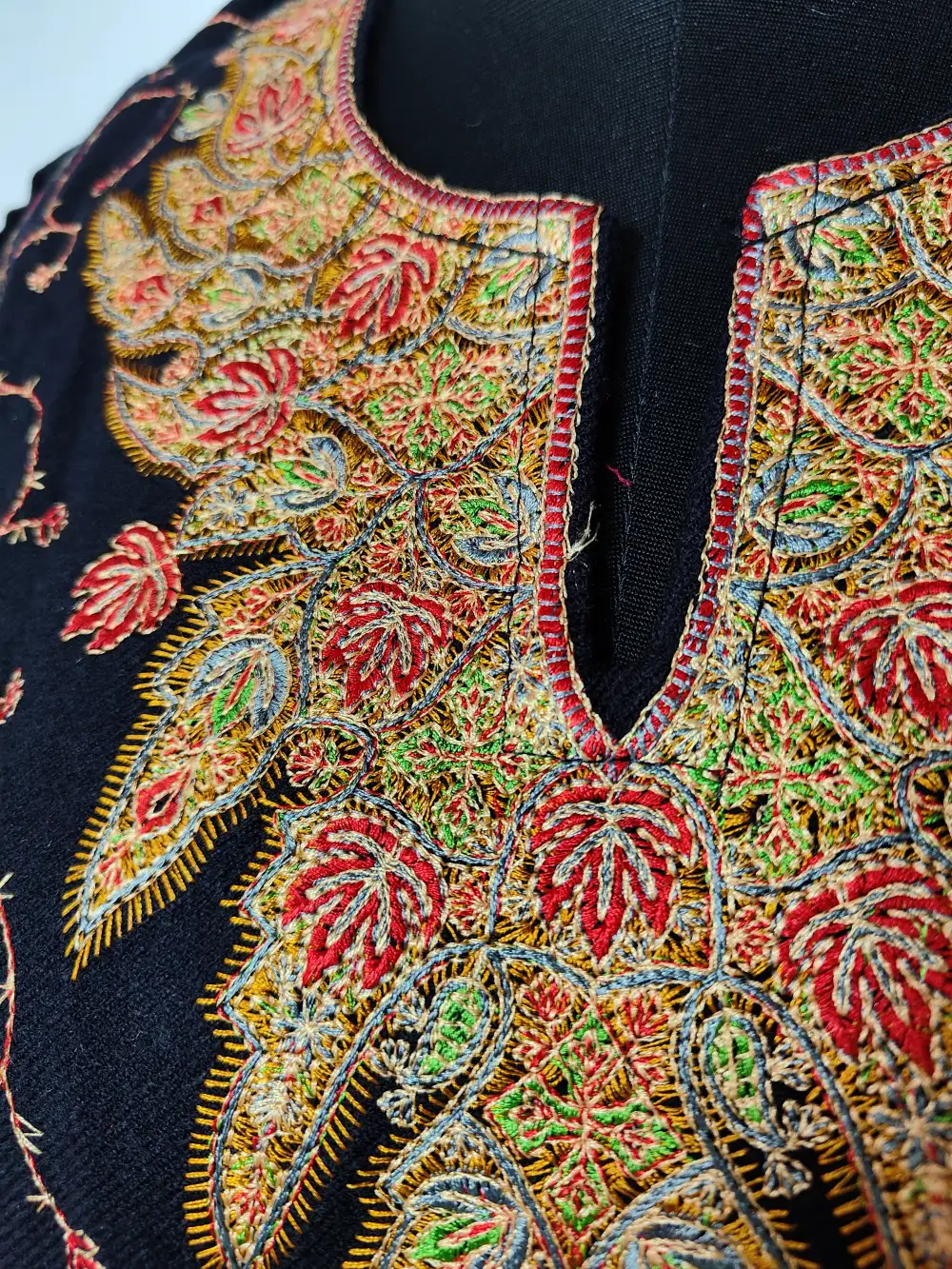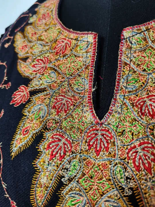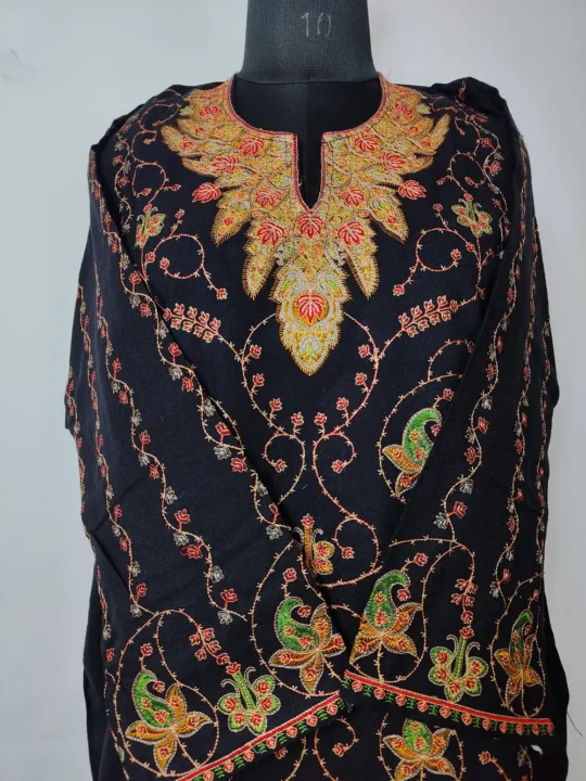 Made for elegance and warmth, this black color 3pc pheran set in cashmilon wool comes pheran, trouser, and dupatta.. The embroidery in Sozni style adds tiny chinar motif designs at the neckline, while all over the the piece flows in vine and booti patterns. The overall detailing creates a lively yet refined effect, which makes it a graceful garment for women during the colder season.