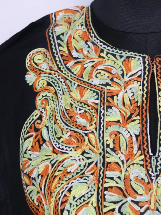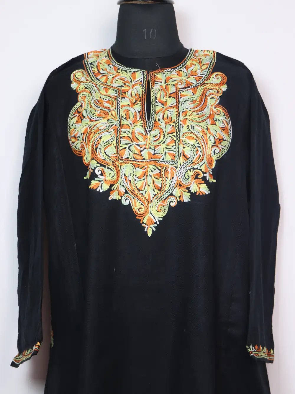 Prepared from cashmilon wool for winter comfort, this kashmiri feran appears in black colour. Its floral and badam aari embroidery highlights the neckline.