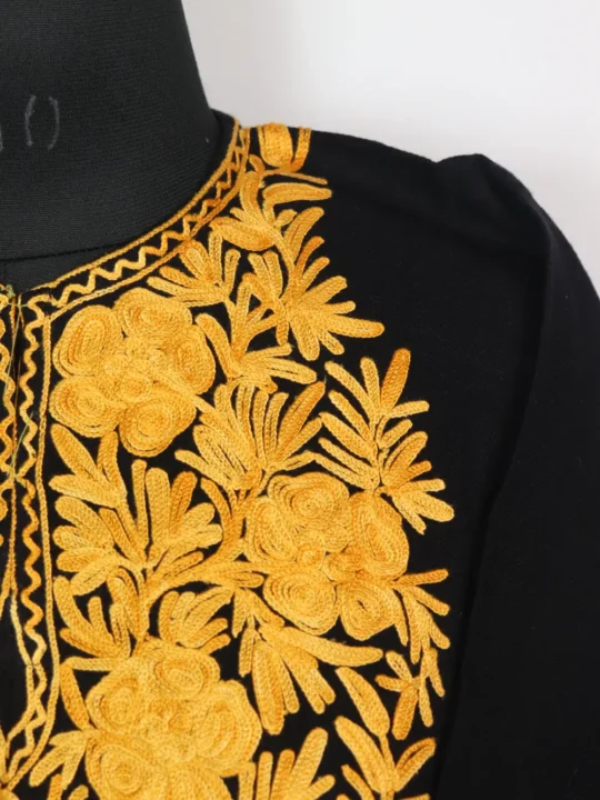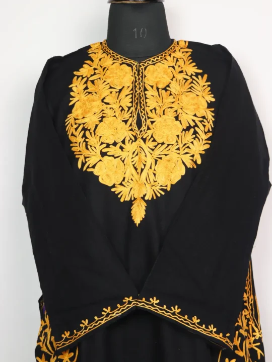 This Cashmilon wool stylish Kashmiri is detailed with Aari work at the neckline in floral motifs and at side panels in jaal work which enhances the black surface. It has chest size 48 inches and length 41.5 which provide a roomy fall.