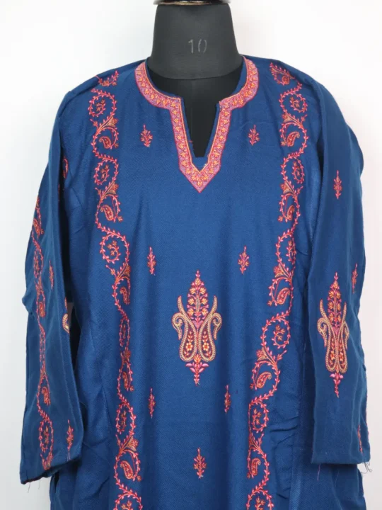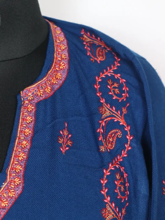 Made in cashmilon wool this Jashn-e-Rekhta Kashmiri feran shows Sozni embroidery in continuous lakeer and booti style work all over the front panel and neckline.