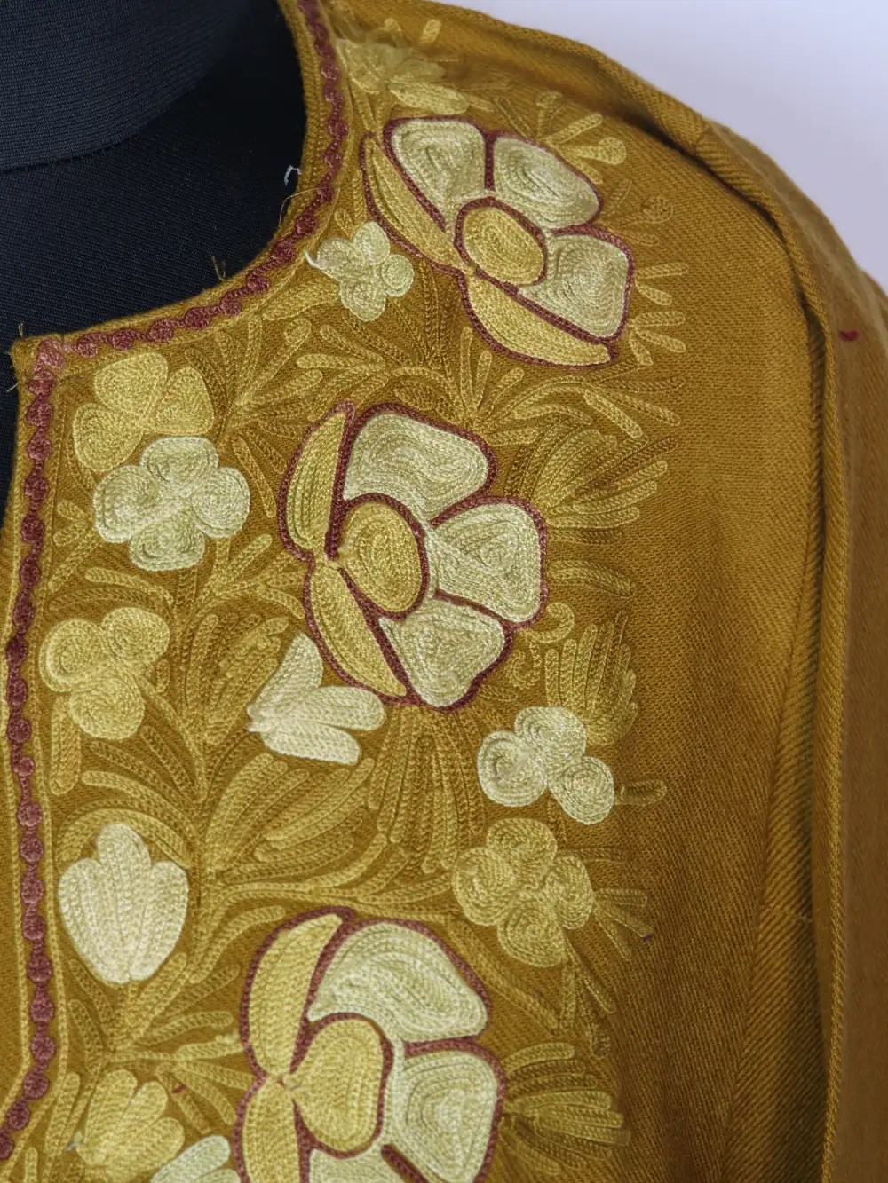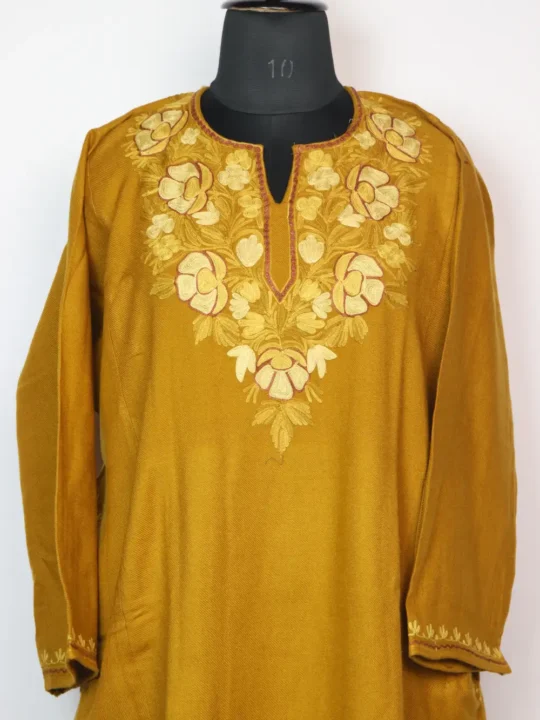 Stylish bush brown Kashmiri feran dress stitched in Cashmilon wool highlights floral embroidery at neckline. It comes with chest size 50 inches and length 43 that gives a roomy fit.