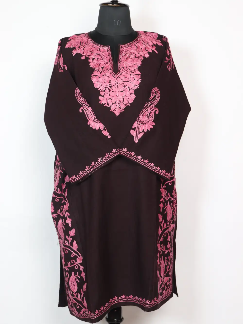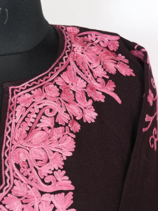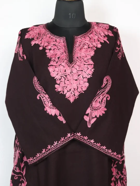 A classic winter choice, this dark brown Cashmilon Wool Pheran features Aari kaam around the neckline in badam motifs and its side panel and sleeves are also embroidered in jaal pattern and booti style respectively – all done by using soft pink hue threads. It comes with 49 inches chest size and 43 inch length, and it also includes two side pockets for usefulness. This phiran dress keeps the rest of the body plain so the neckline, sleeves and side panels reads like the quiet focal point. For simple shopping convenience you can buy this kashmiri pheran online at just 1899 to enjoy traditional warmth at home.
